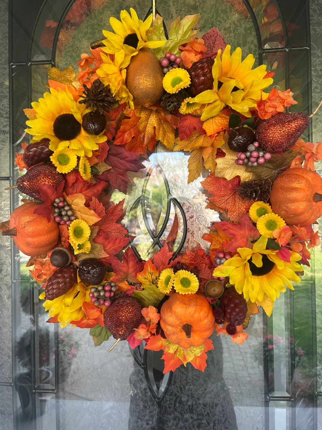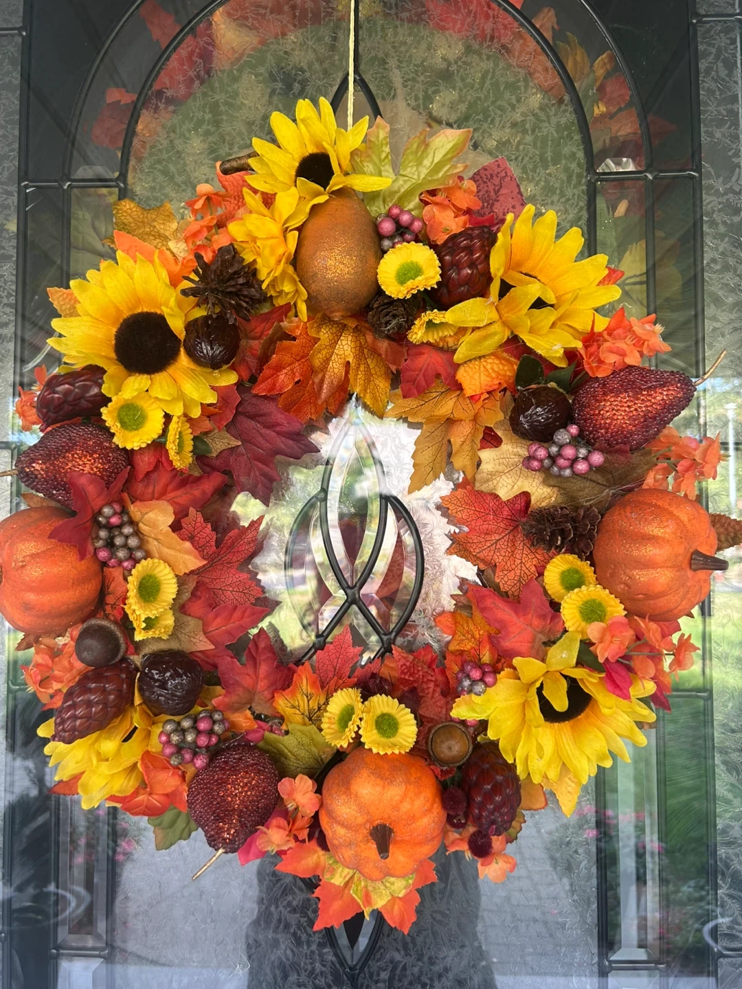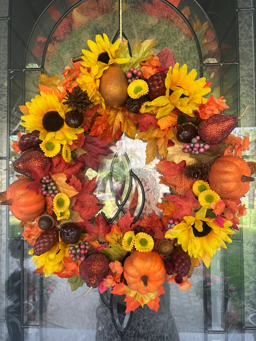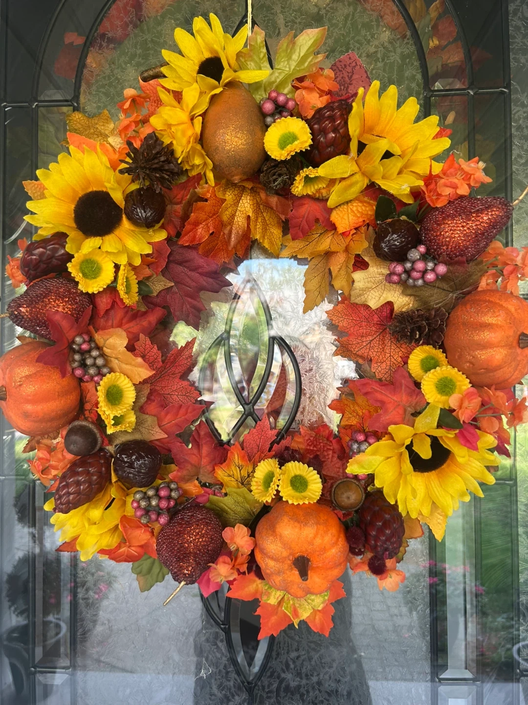 A beautiful fall harvest wreath to add a touch of autumn to your home. It features sunflowers, pumpkins, leaves, and other seasonal accents. Perfect for your front door or as a wall decoration!