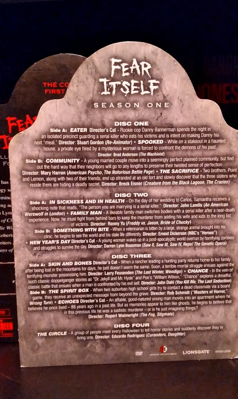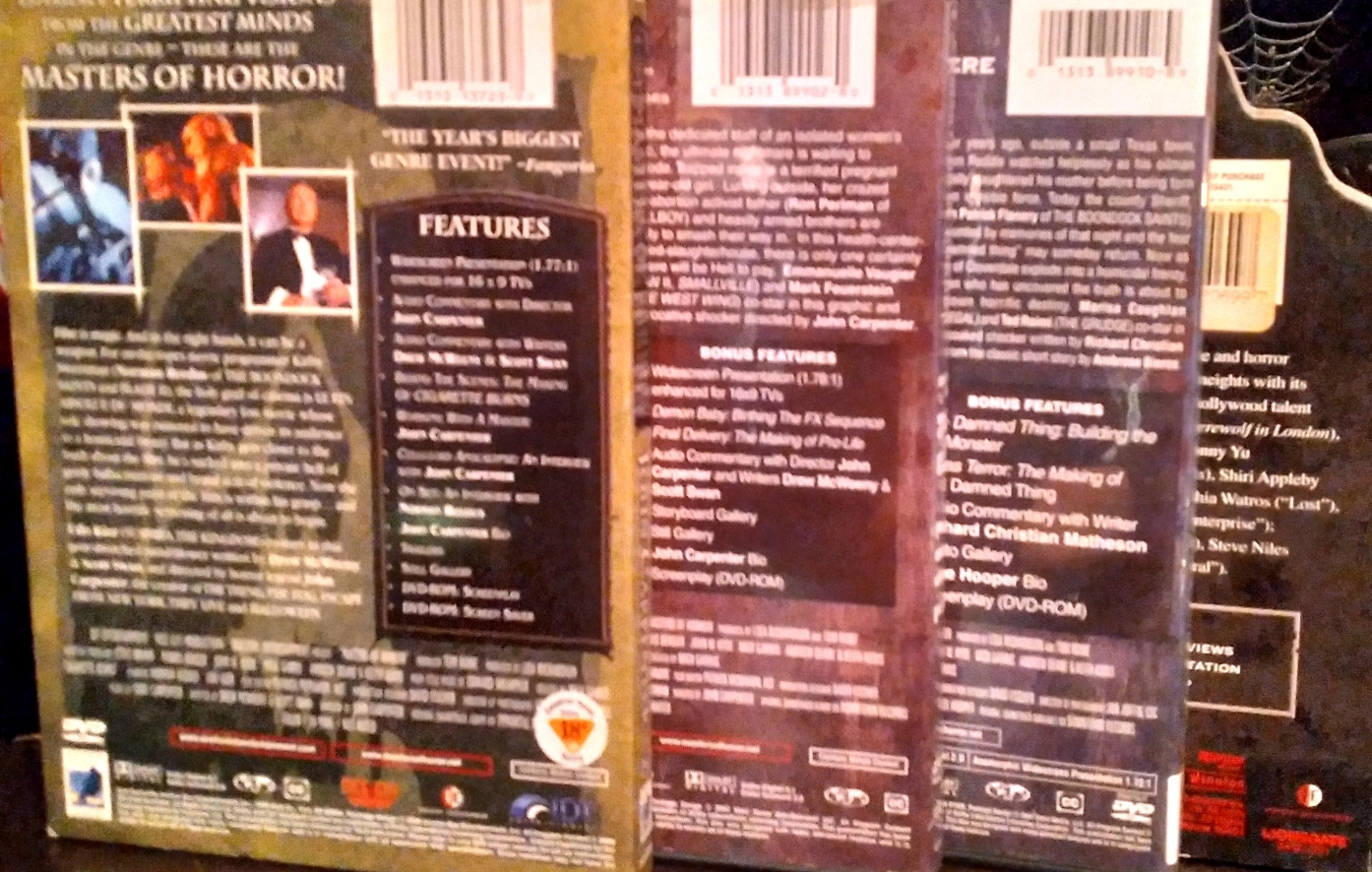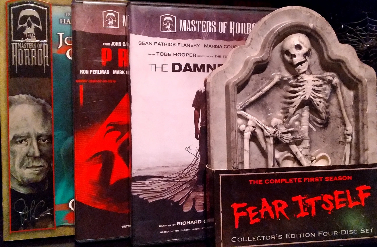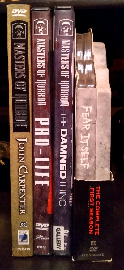 HORROR TV SERIES' LOT - MASTERS OF HORROR - JOHN CARPENTER’S CIGARETTE BURNS - JOHN CARPENTER’S PRO LIFE - TOBE HOOPER'S THE DAMNED THING FEAR ITSELF: THE COMPLETE FIRST SEASON COLLECTOR'S EDITION FOUR-DISC SET ...HOURS OF CONTEMPORARY HORROR TV VIEWING. TITLES ARE IN GOOD CONDITION. ALL ARE COMPLETE. CASES/ COVERS MAY HAVE MILD TO MODERATE SHELF WEAR. SOME DISCS MAY HAVE A FEW SCUFFS OR LIGHT SUPERFICIAL SURFACE MARKS WHICH DO NOT APPEAR TO AFFECT PLAY. FEAR ITSELF IS A FORMER RENTAL AND SHOWS SOME ADDITIONAL WEAR, INCLUDING CLOUDY-LOOKING DISCS, RENTAL STICKERS AND OTHER MARKINGS. ALL HAVE BEEN VIEWED WITHOUT ISSUE. PRICE IS FOR THE LOT. CASH AND PICK-UP ONLY. QUEEN ST EAST AND BROADVIEW. RIVERSIDE.