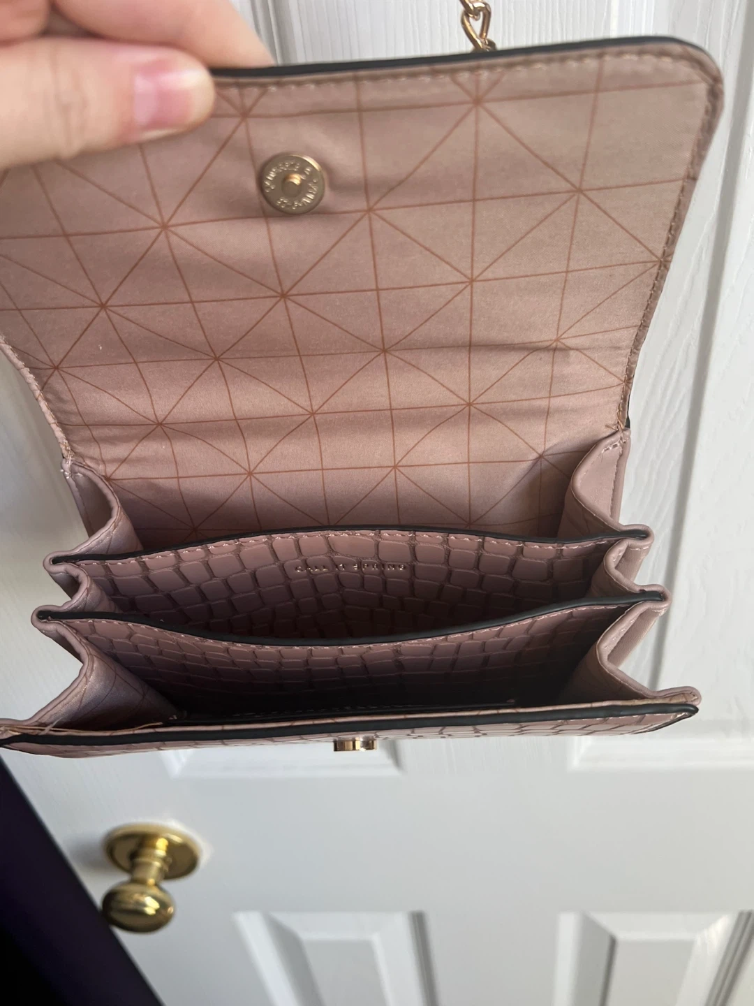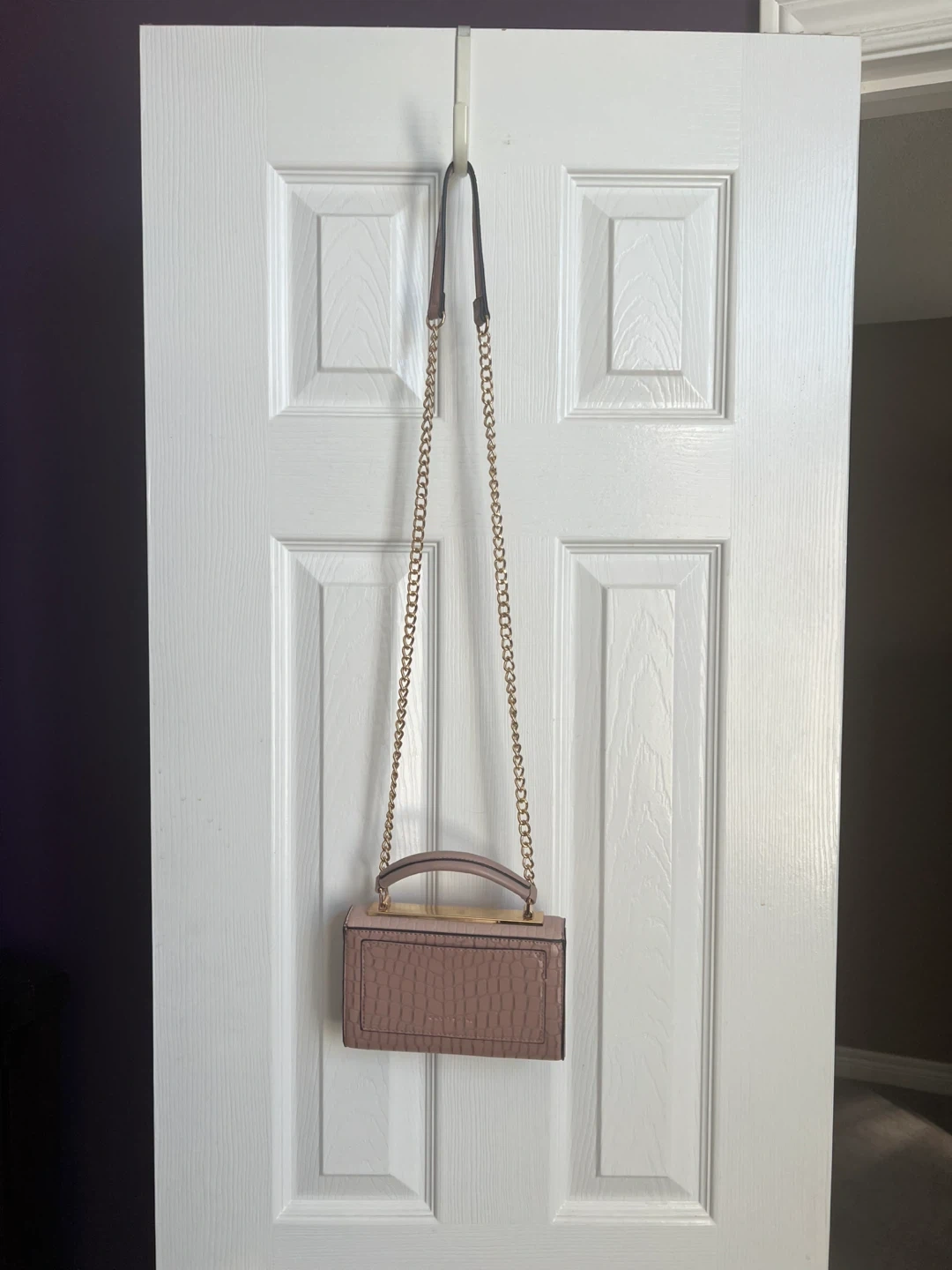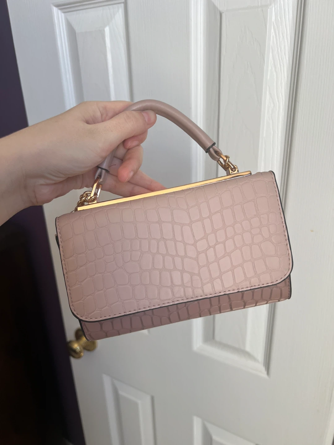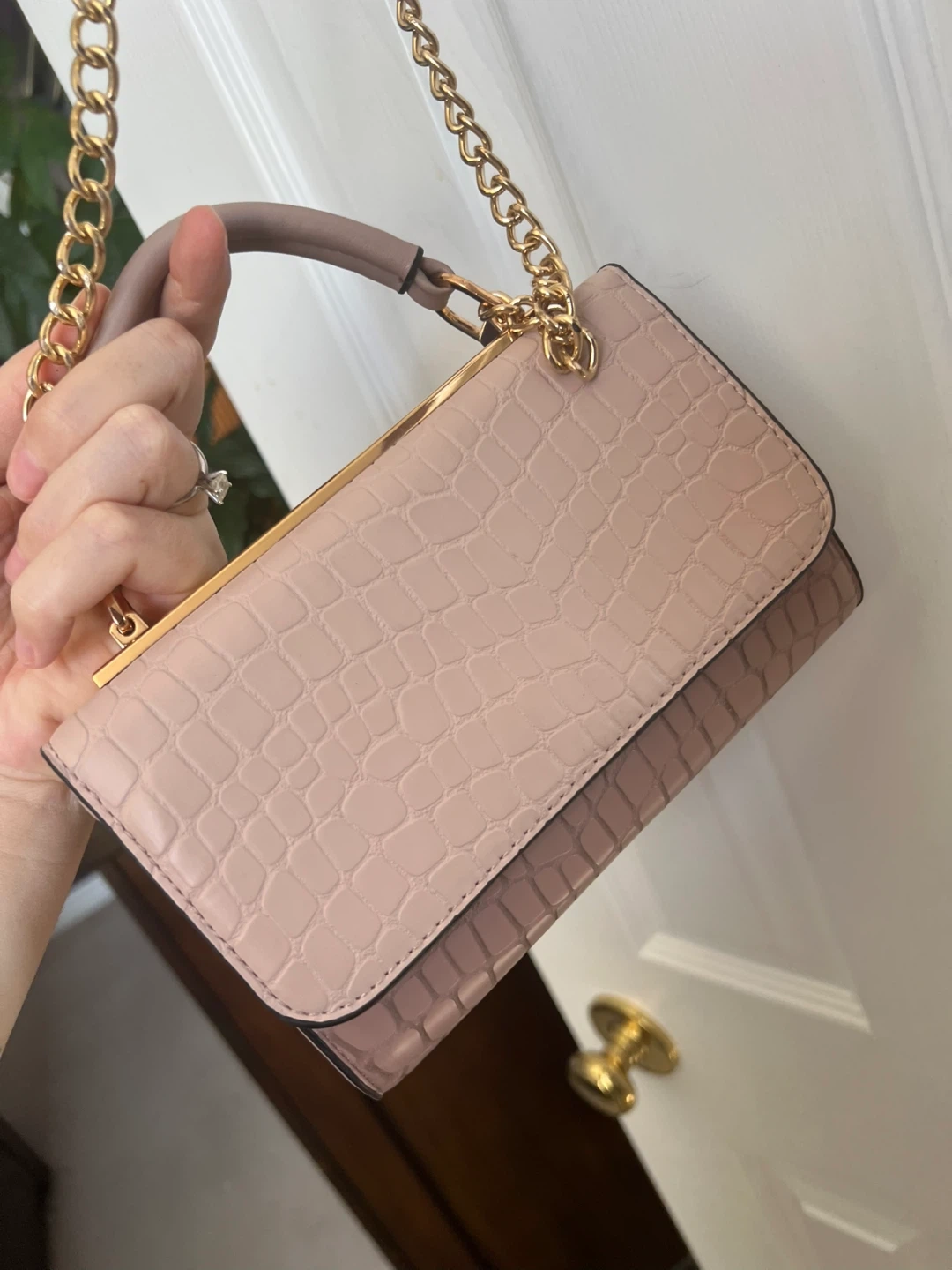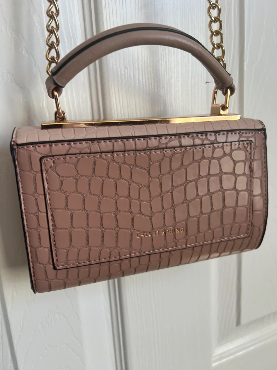 This is a Call It Spring top handle bag with a gold chain strap. It features a unique crocodile pattern and a structured design. Perfect for adding a touch of elegance to any outfit!
