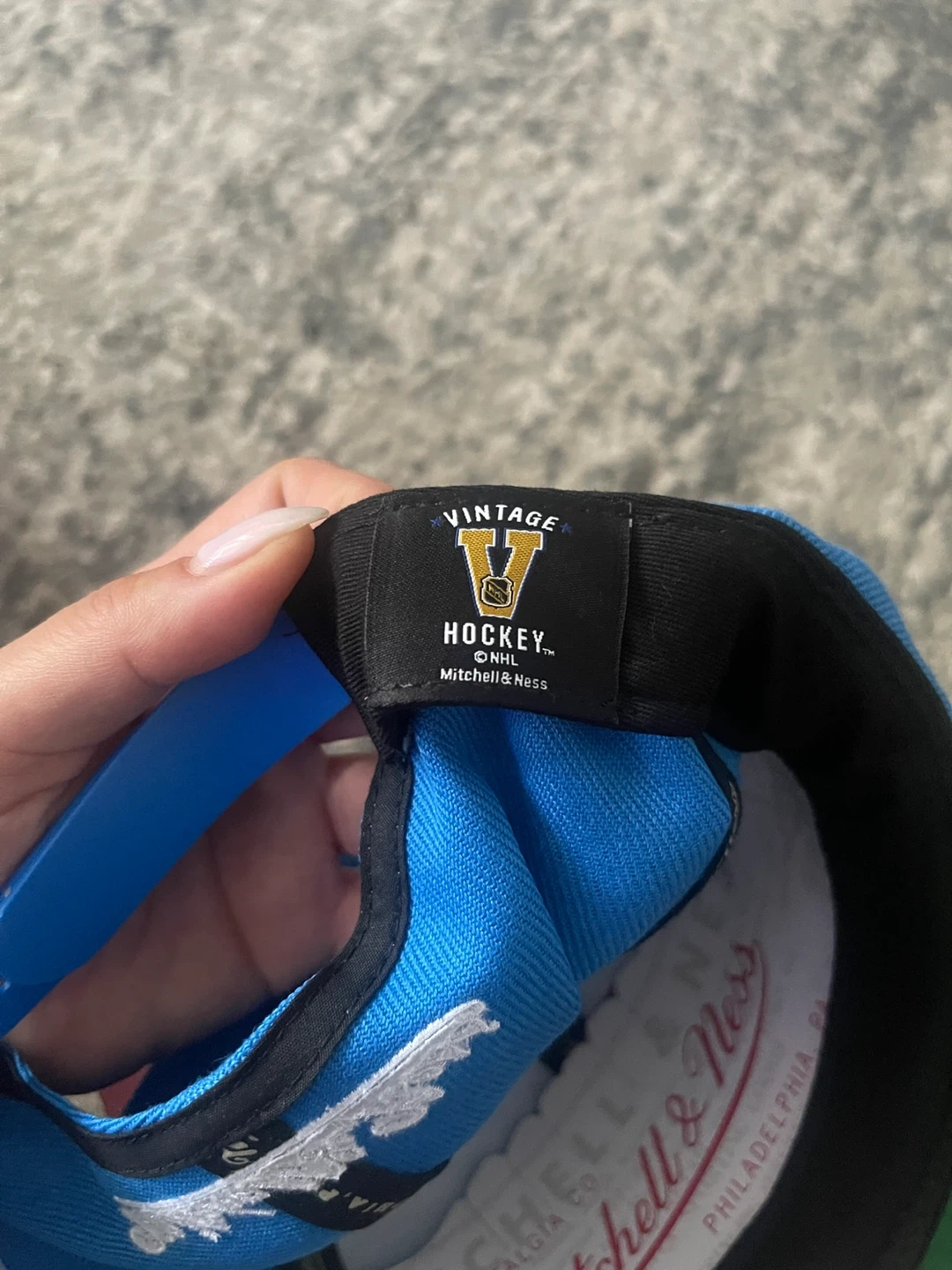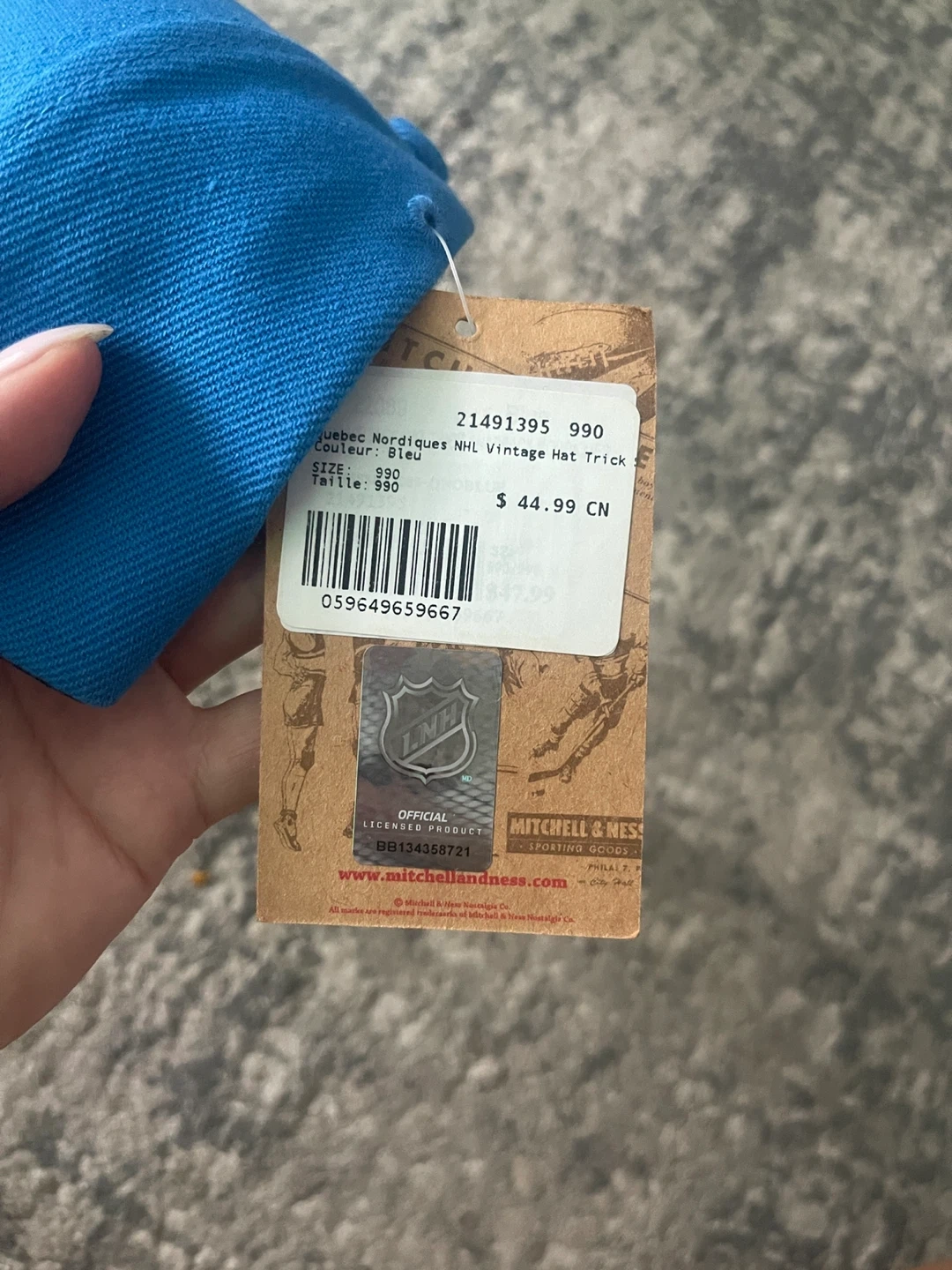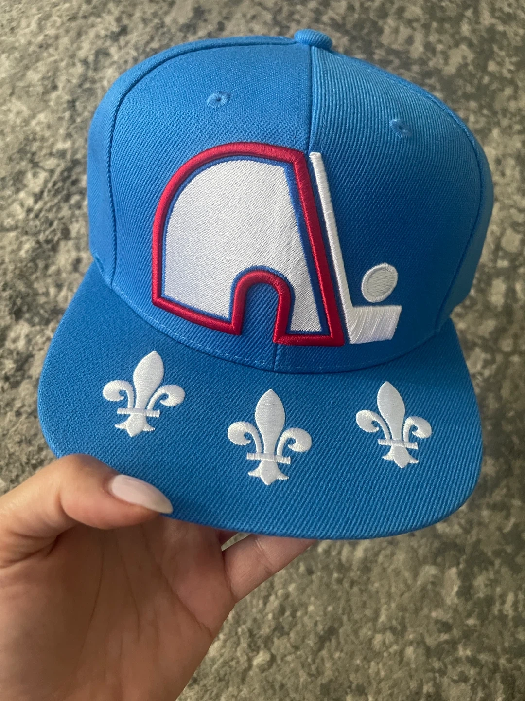 Selling a Mitchell & Ness Quebec Nordiques cap in great condition! The cap is light blue with the Nordiques logo on the front and fleur-de-lis designs. It is a vintage hockey cap.