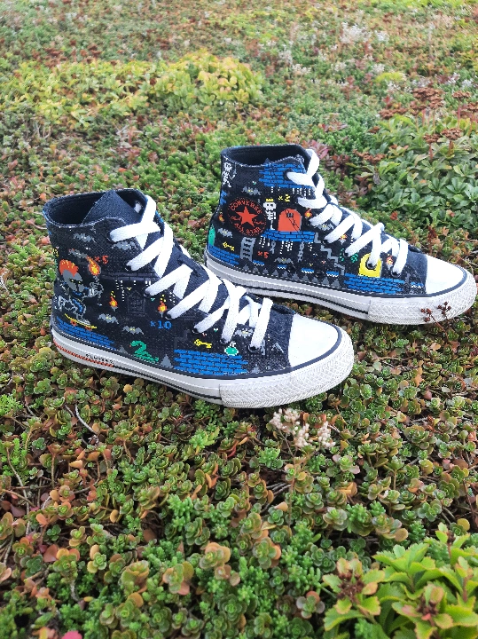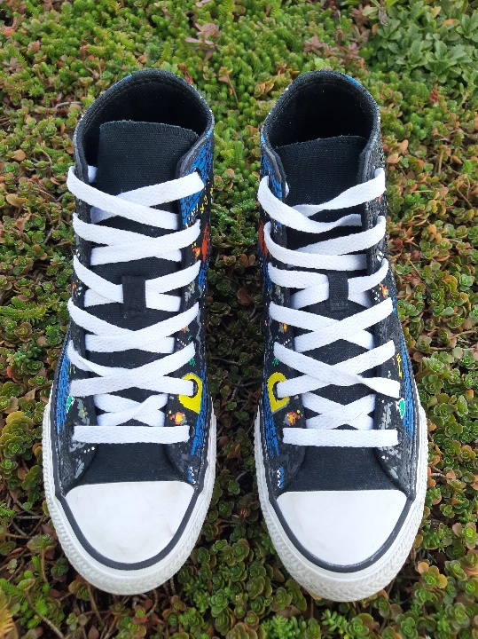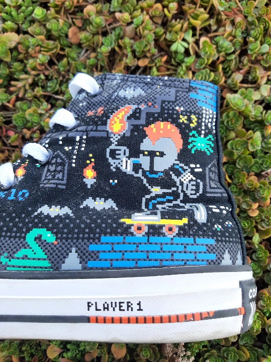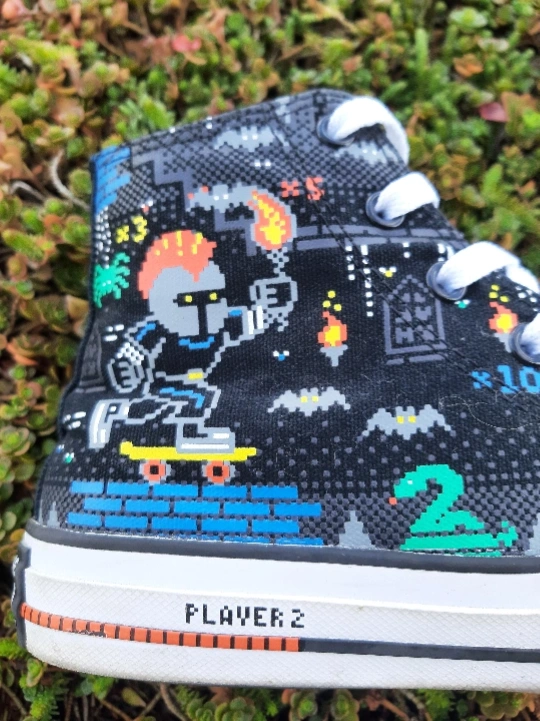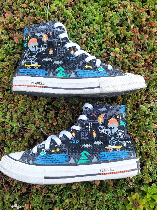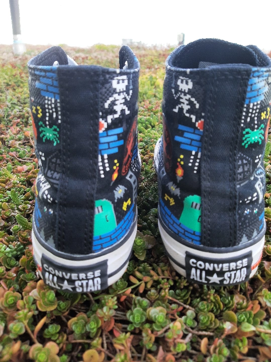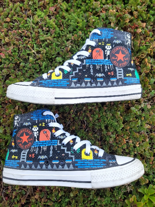 Cool pair of Converse Chuck Taylor All Star high tops! They feature a unique pixelated video game-inspired design. Great for adding a pop of fun to any outfit. They are in good used condition, ready for a new home