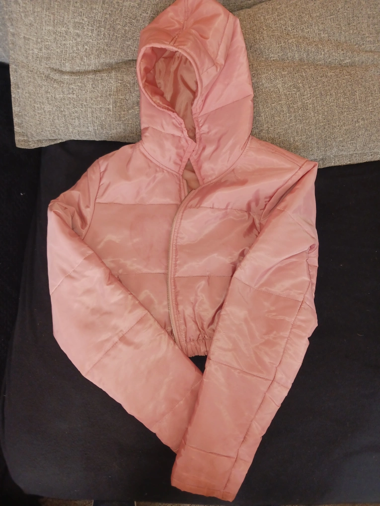 Selling a cute pink puffer jacket! It's in great condition and perfect for layering. The jacket is a lovely shade of pink and has a hood for extra warmth. It's a cropped style, making it a trendy addition to any outfit
