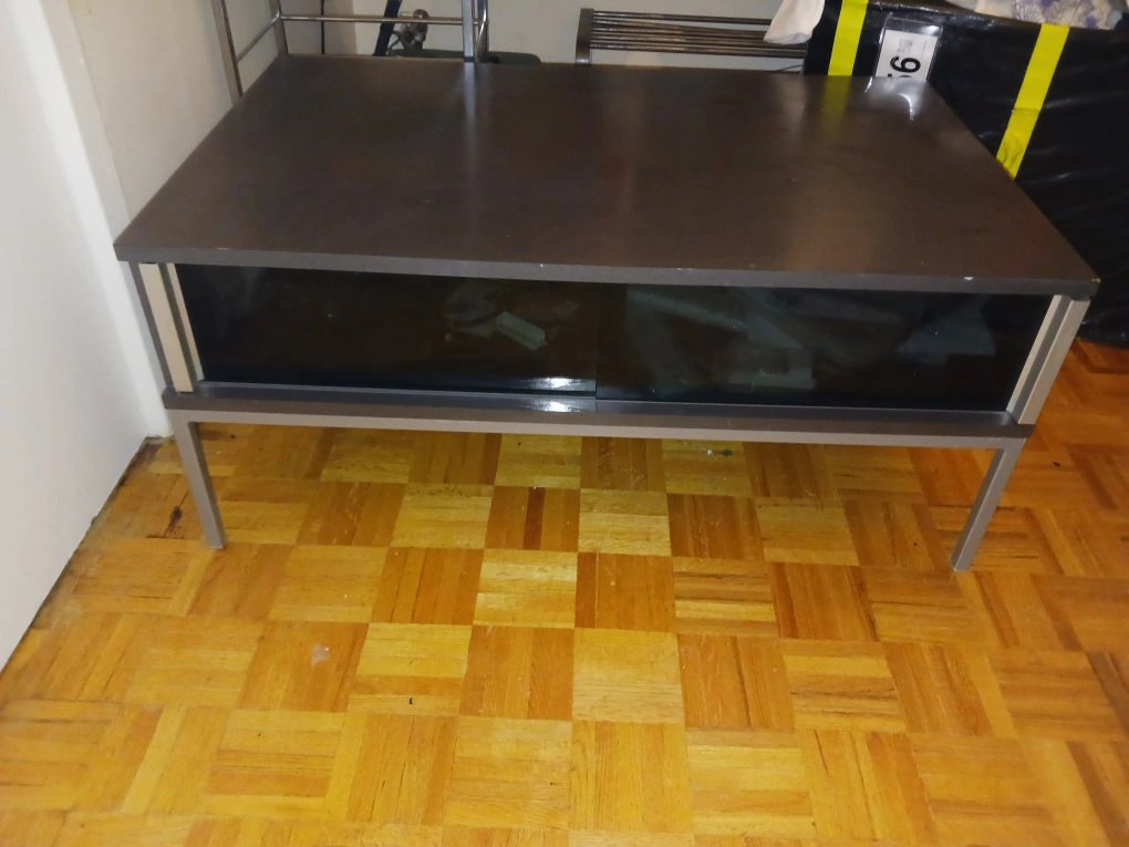 Selling a coffee table with a sleek grey top and a glass storage doors underneath. It's in good condition and would look great in any living room. Perfect for holding books, magazines, or displaying decorative items