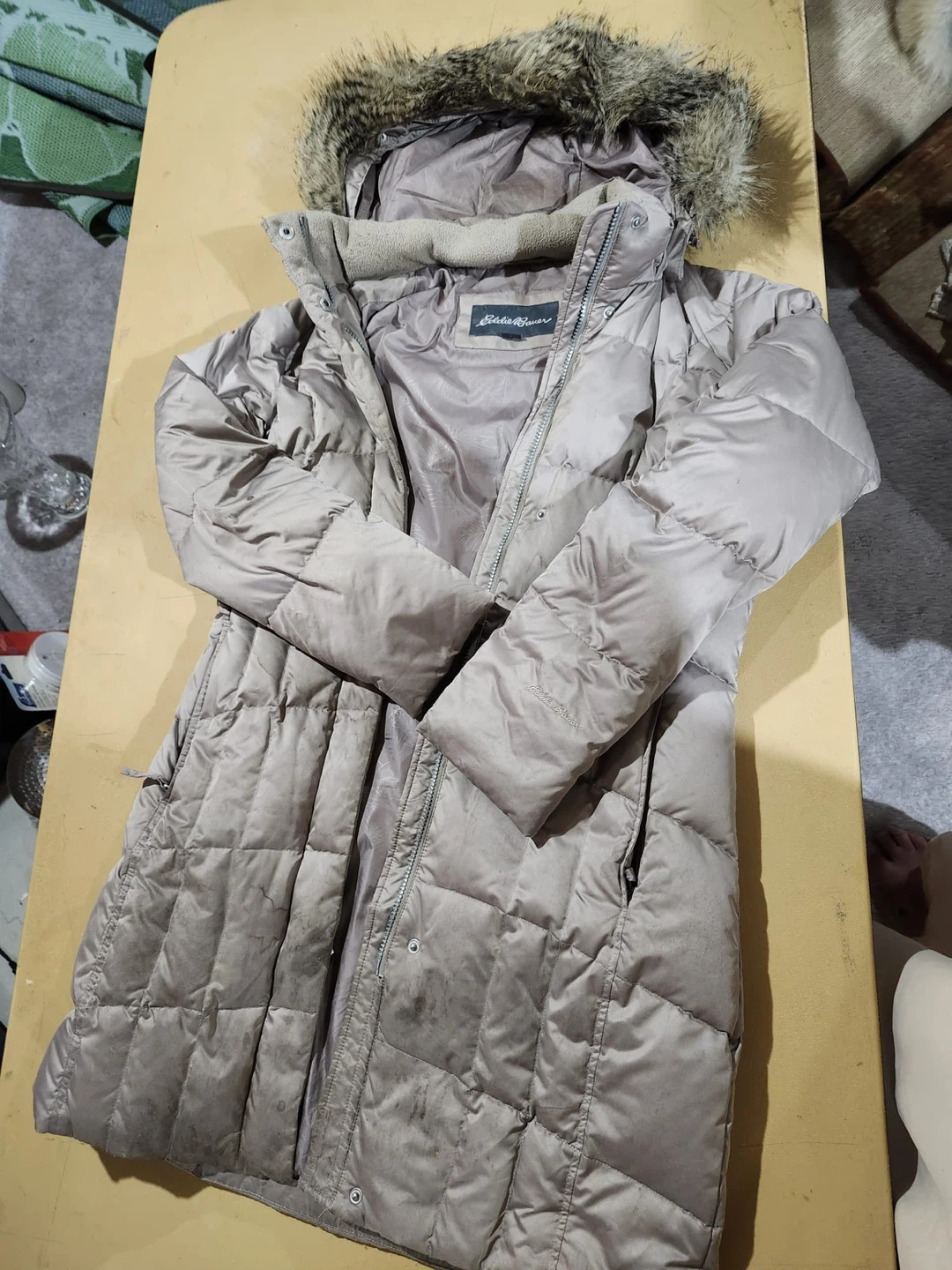 Cozy Eddie Bauer down parka in size small. It's perfect for staying warm during the colder months! The parka features a faux fur-trimmed hood and a quilted design. It has some signs of use, but it's still in good condition and ready to keep you snug