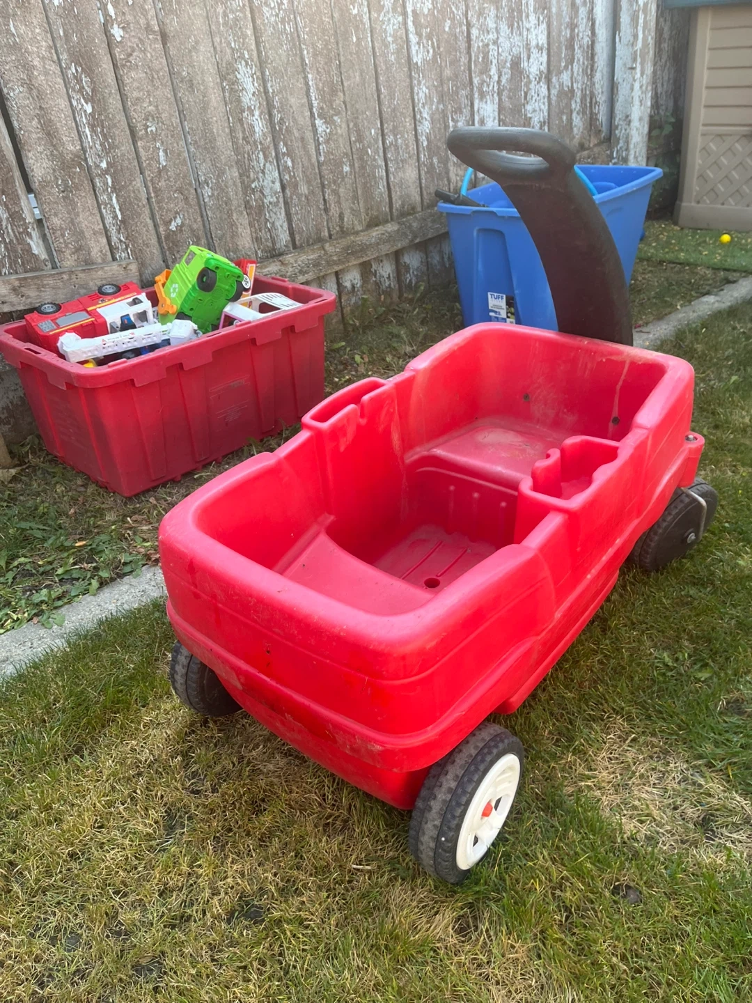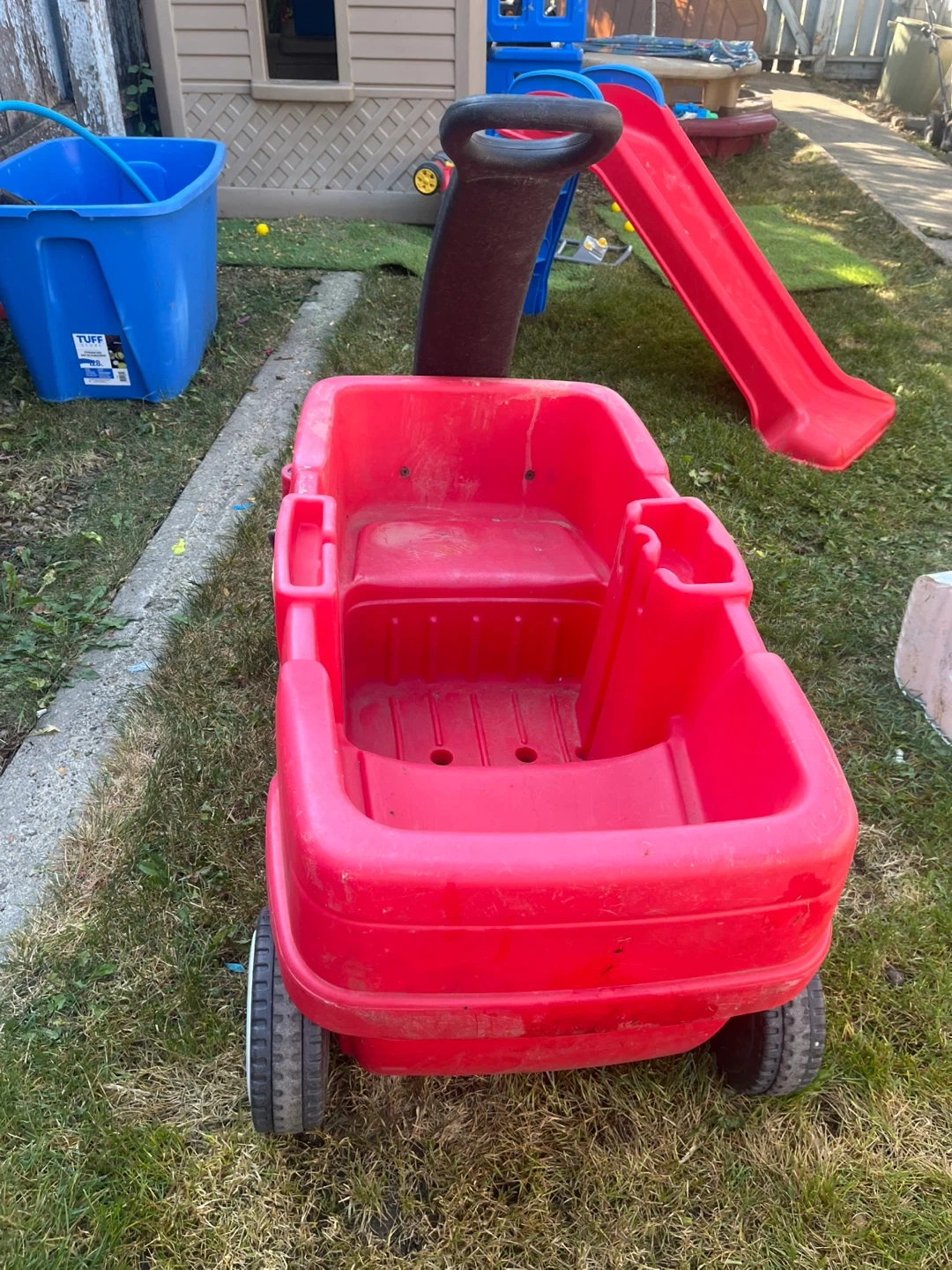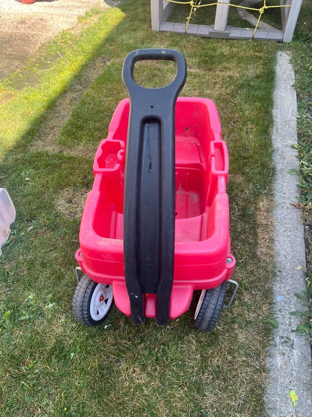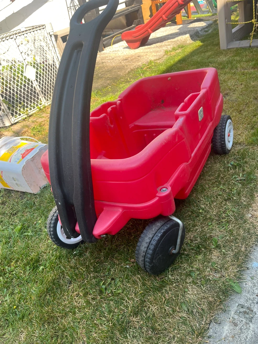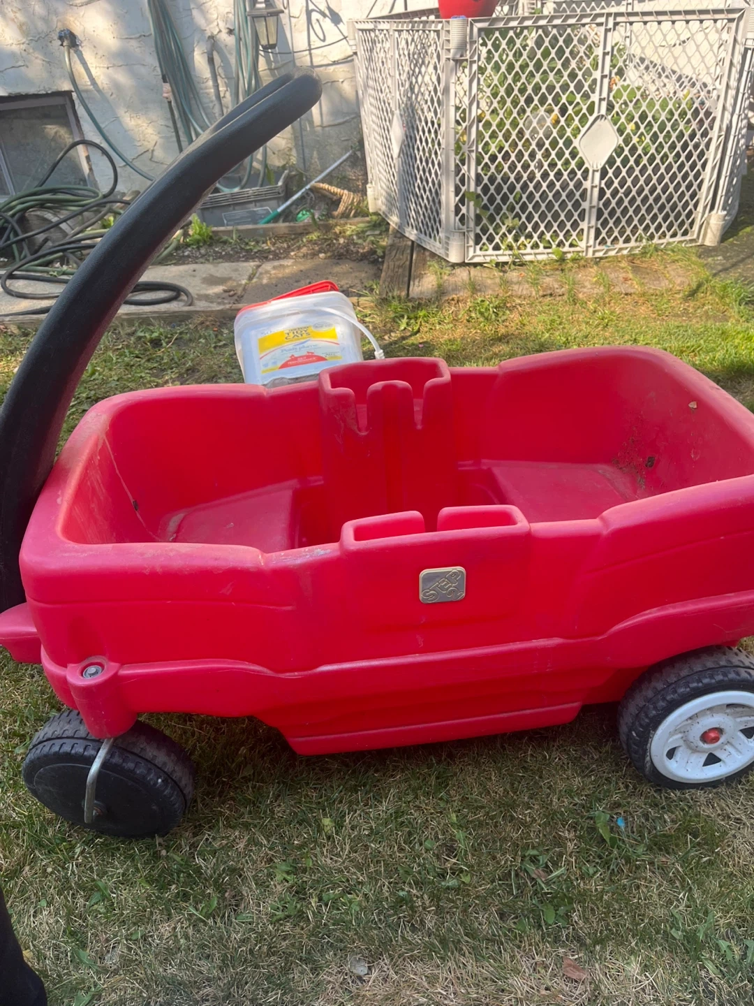Selling a red wagon by Step2! It's perfect for hauling kids around the yard or park. It has a handle for easy pulling and a seat for little ones to ride comfortably. It's in good condition and ready for a new home!