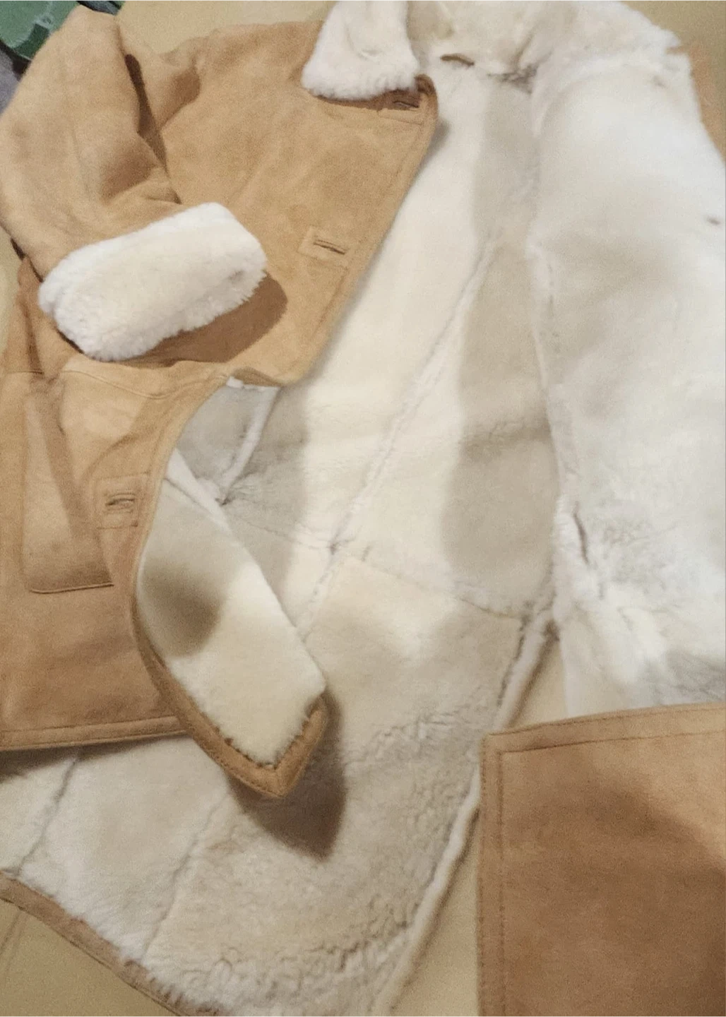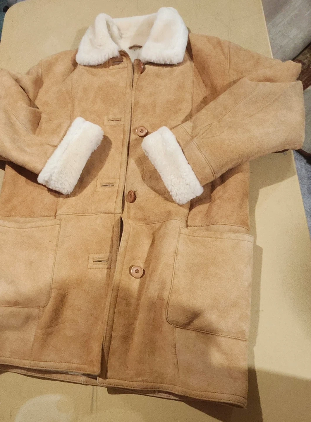 Selling a cozy shearling coat in a neutral tan colour! It's a size medium and perfect for keeping warm during the colder months. The coat features a soft, plush shearling lining and trim, adding to its warmth and comfort. It has a classic design with button closures and functional pockets. This coat is in great condition and ready for a new home!