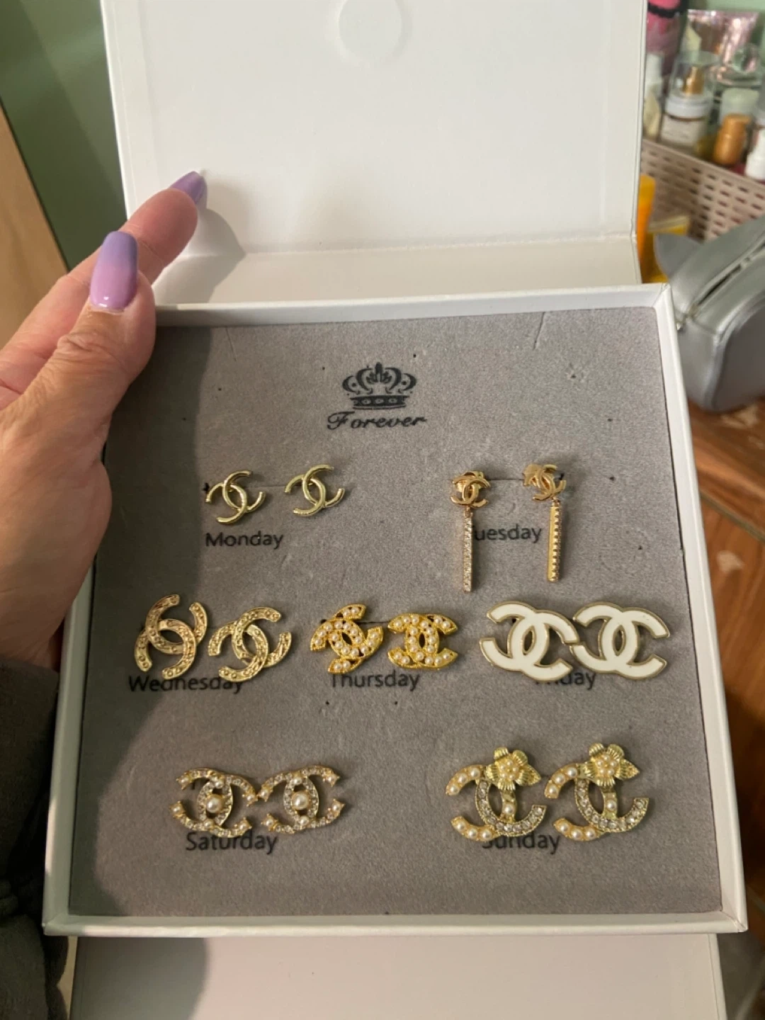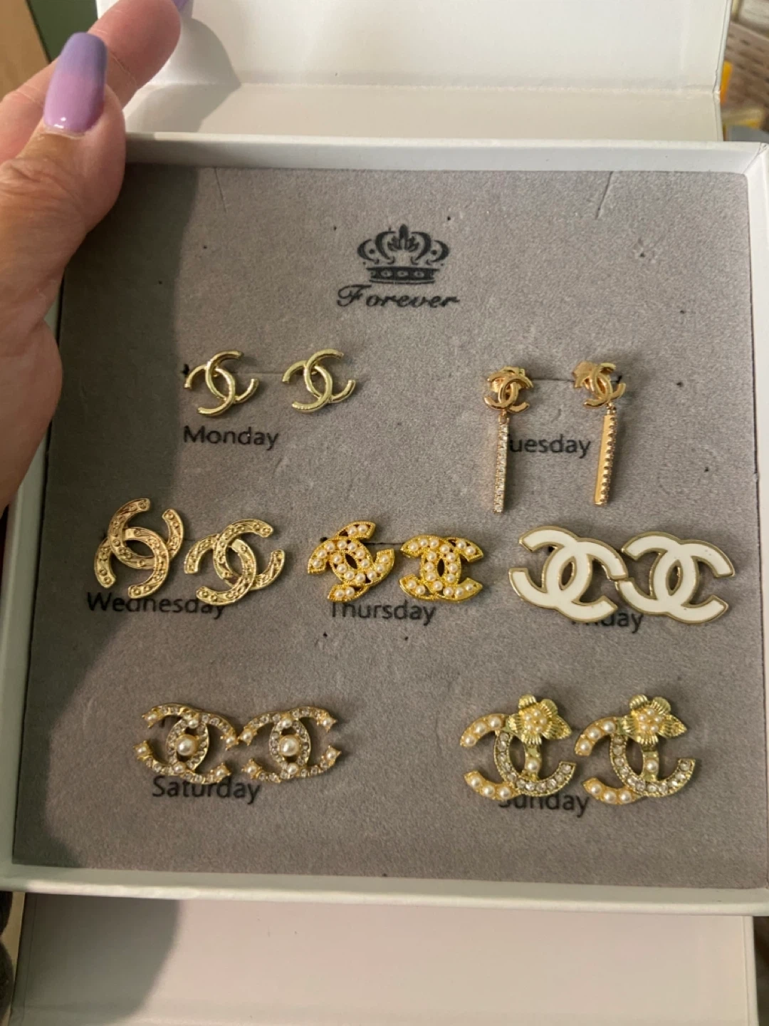 Selling a brand new set of Chanel earrings, still in the original box! This set includes a variety of styles for each day of the week. Perfect for adding a touch of elegance to any outfit. Get this beautiful set today! • “This item is brand-inspired, not the official product Low baller will be block !