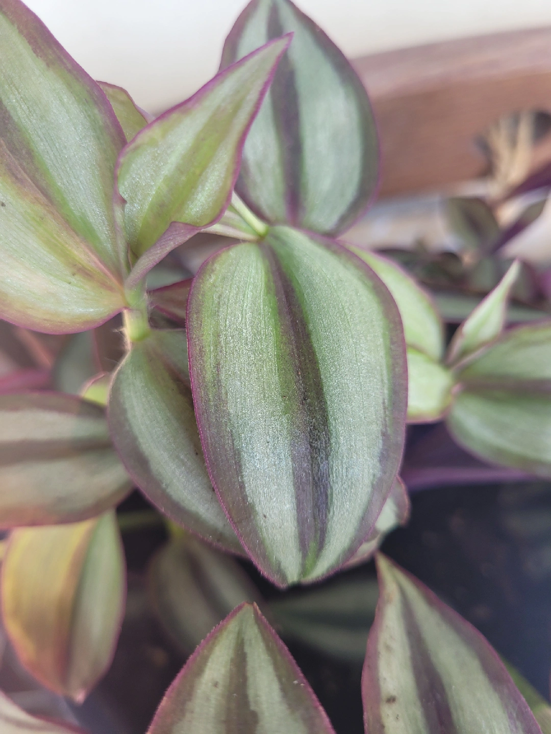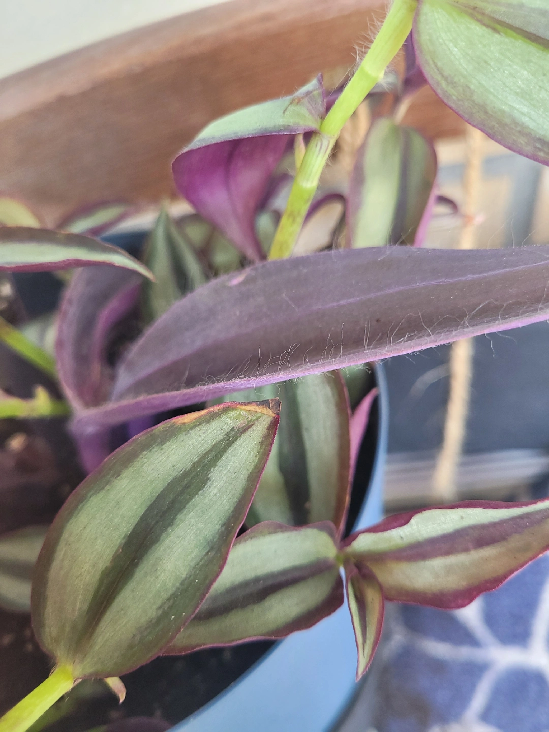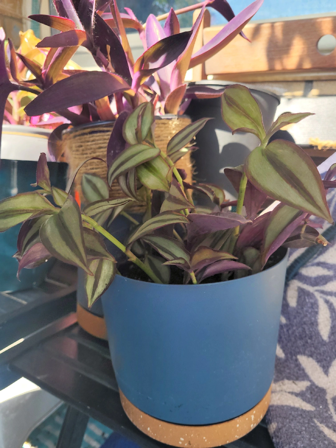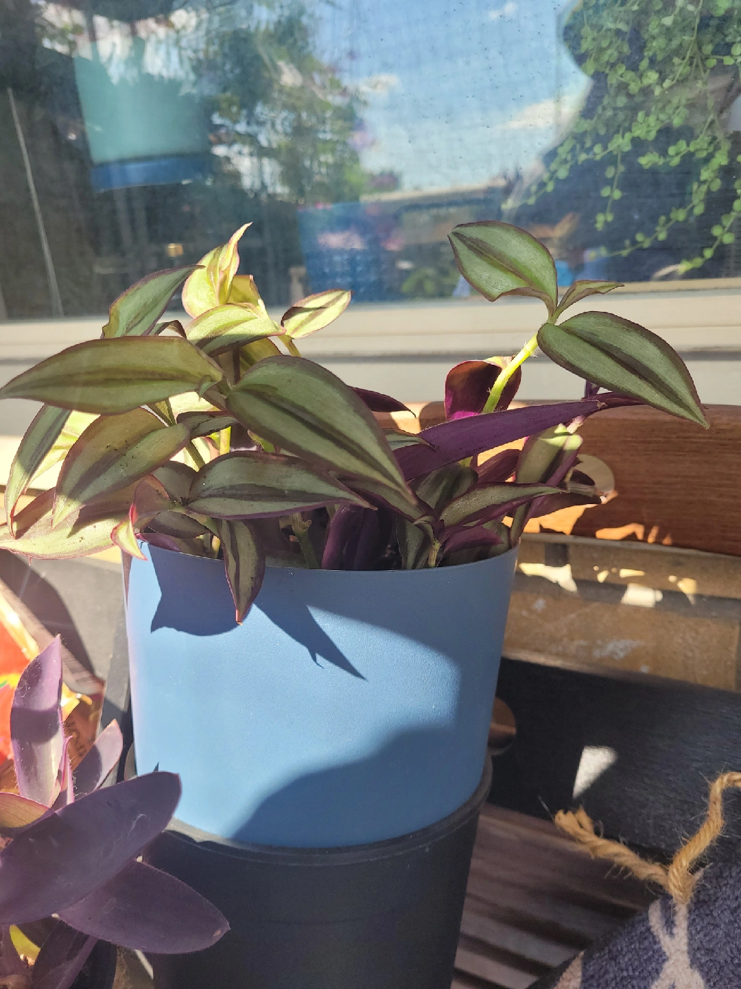 I'm selling a healthy Tradescantia zebrina, in a charming blue pot. It's a beautiful and easy-to-care-for houseplant that will add a touch of colour to any room