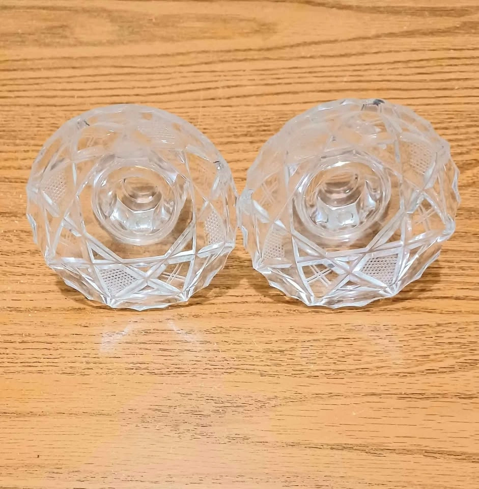 Pair of Vintage Crystal Candle Holders. Made of Heavy Lead Glass with deep, Geometric The Cuts create Patterns of Hobstars and Fans, giving the glass a Sparkling Appearance. High-quality Craftsmanship. Excellent Condition, no chips or cracks. Please check out my other posts