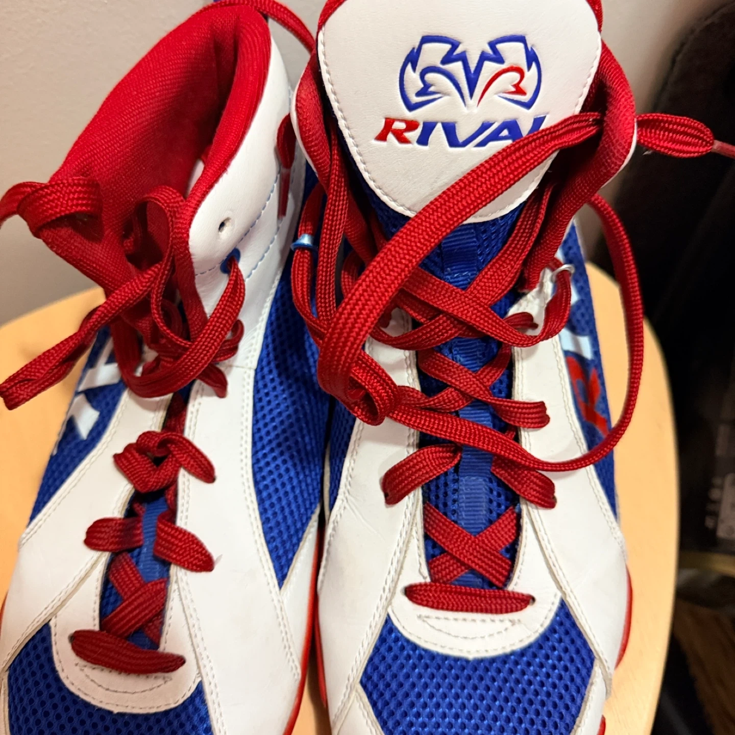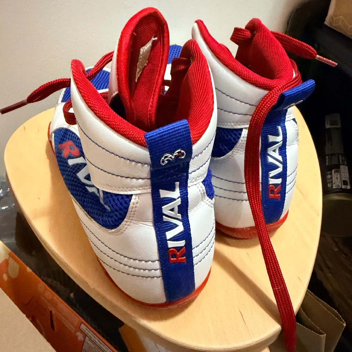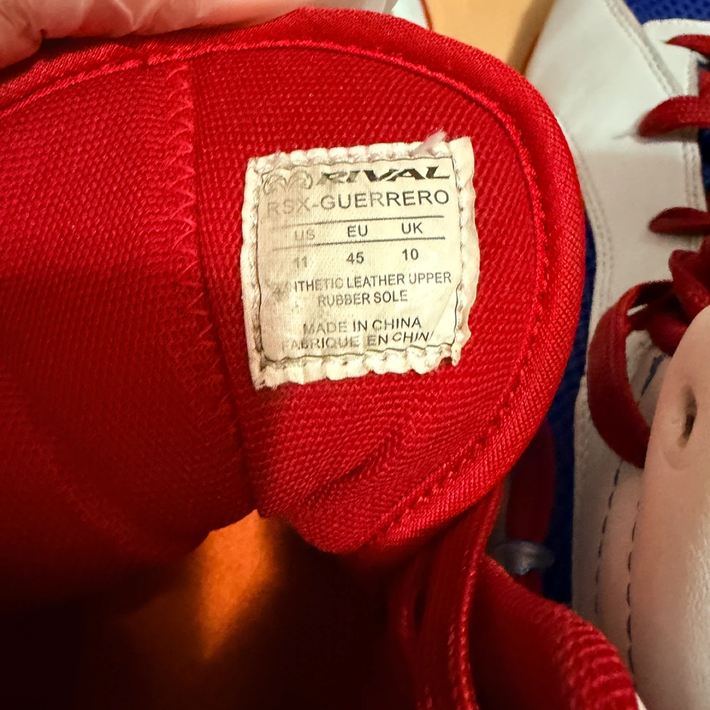 Selling a pair of Rival RSX-Guerrero boxing shoes. They are size US 11, EU 45, UK 10. The shoes are made with synthetic leather upper and rubber sole. They are white, blue, and red in colour.
