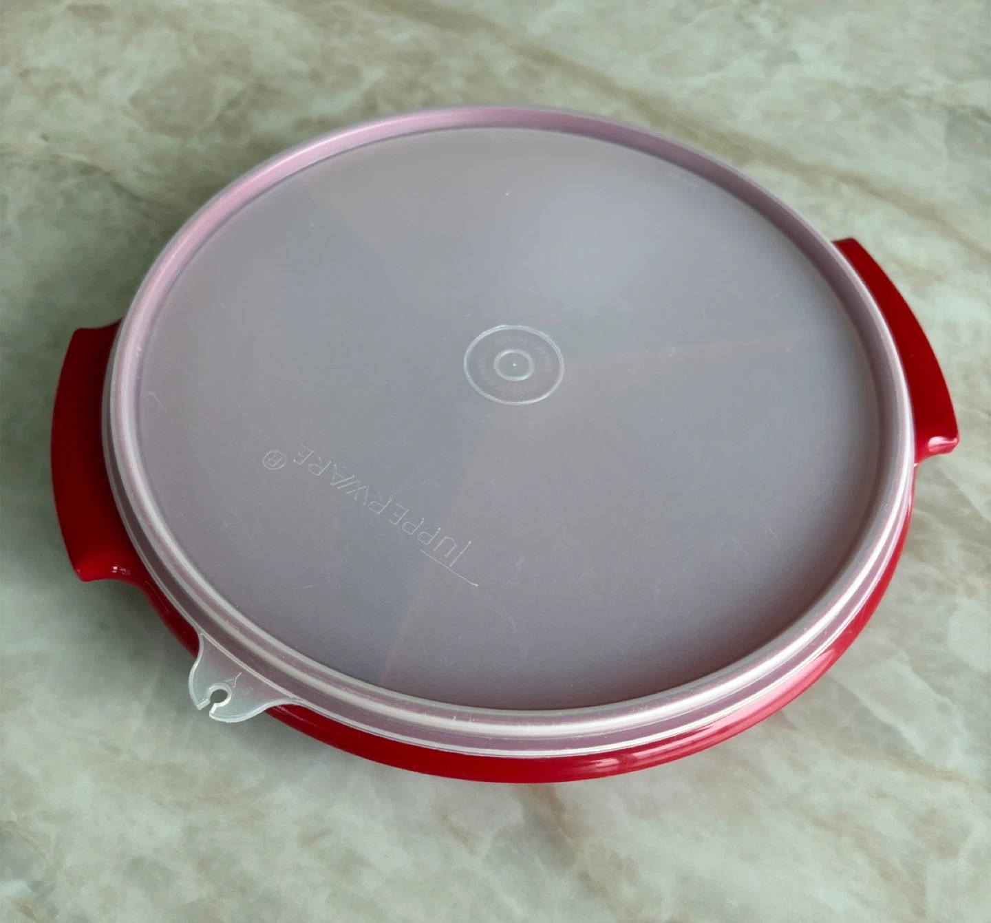 Tupperware round divided dish in red. Great for serving snacks or appetizers! Comes with a lid to keep everything fresh. Perfect for potlucks or parties