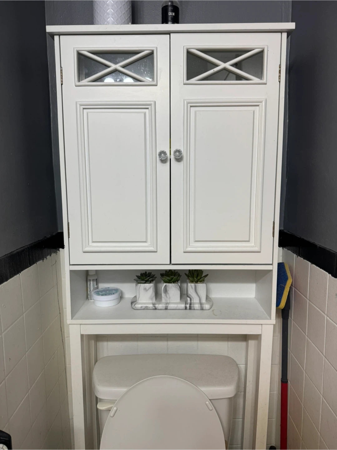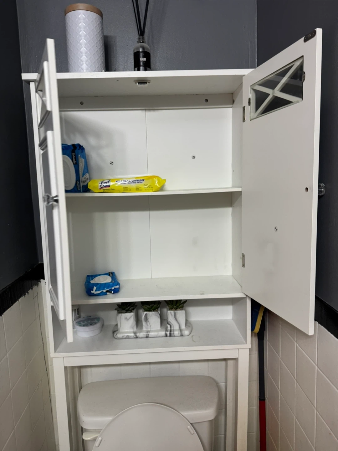 Selling a white over-the-toilet storage cabinet. It's in great condition and perfect for adding extra storage space to your bathroom. It fits neatly over most standard toilets, making it a practical and space-saving solution for organizing your bathroom essentials