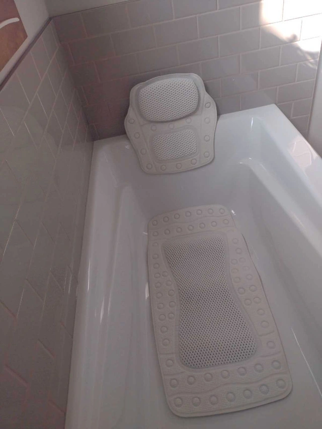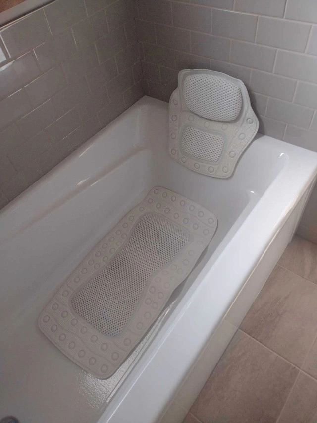 Transform your ordinary bath into a spa-like retreat with this bath pillow and mat set, designed for ultimate comfort and relaxation! As shown in the photos, this set has been previously enjoyed, but it still offers a cozy and supportive experience. Here are some features of the set: * Contoured pillow for neck and head support * Non-slip mat for safety and comfort * Easy to clean and maintain If the ad is up, it's available!