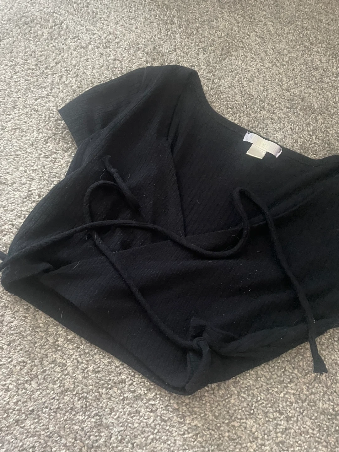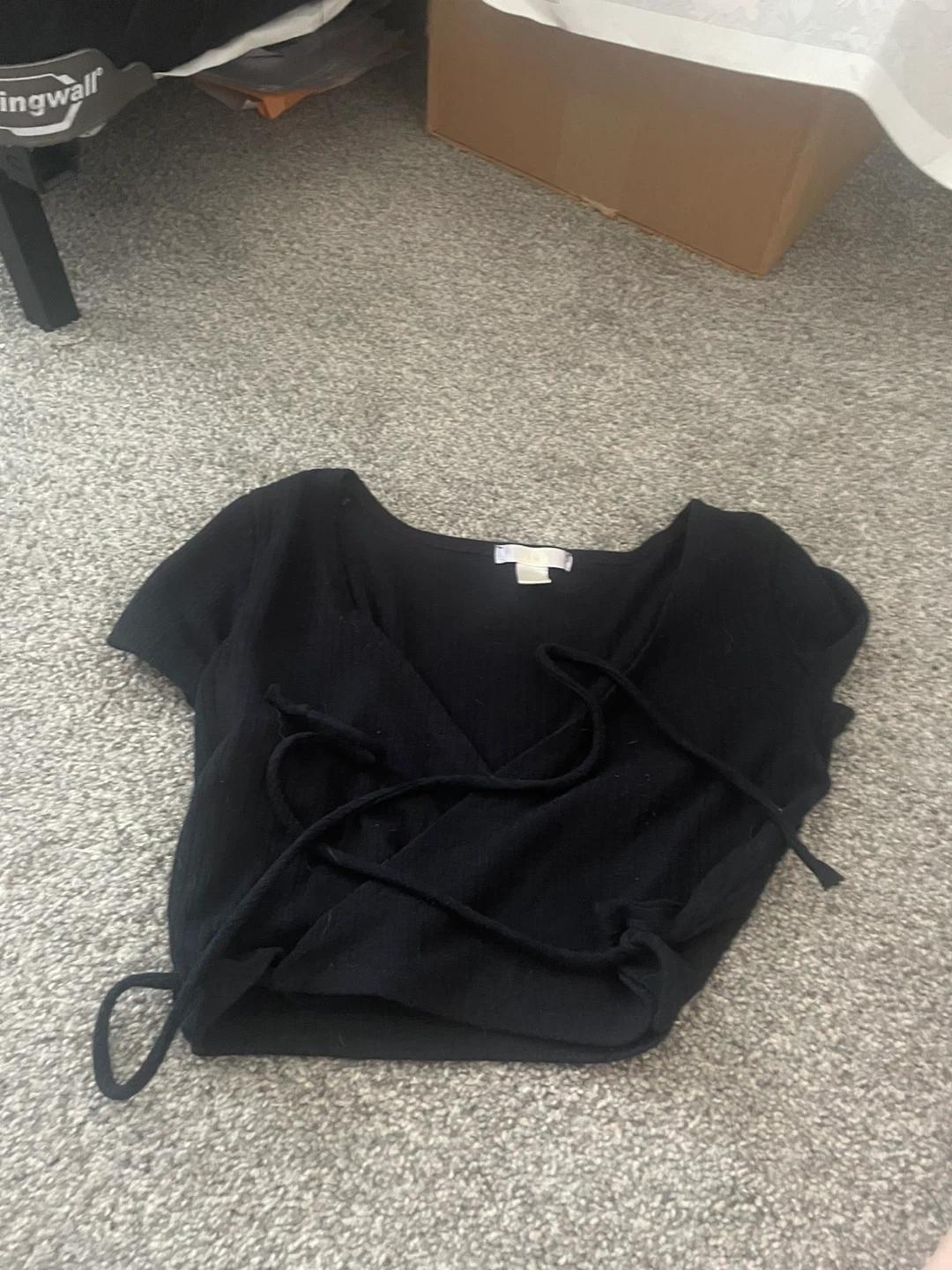 Selling a black wrap crop top! It's in great condition and features a stylish wrap design with tie details! It’s a size XS but honestly fits more like a Small.