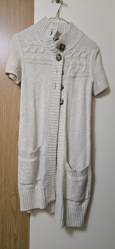 Cozy Gap cardigan in a neutral colour! It's a size small and features a button-up front and short sleeves. Perfect for layering!