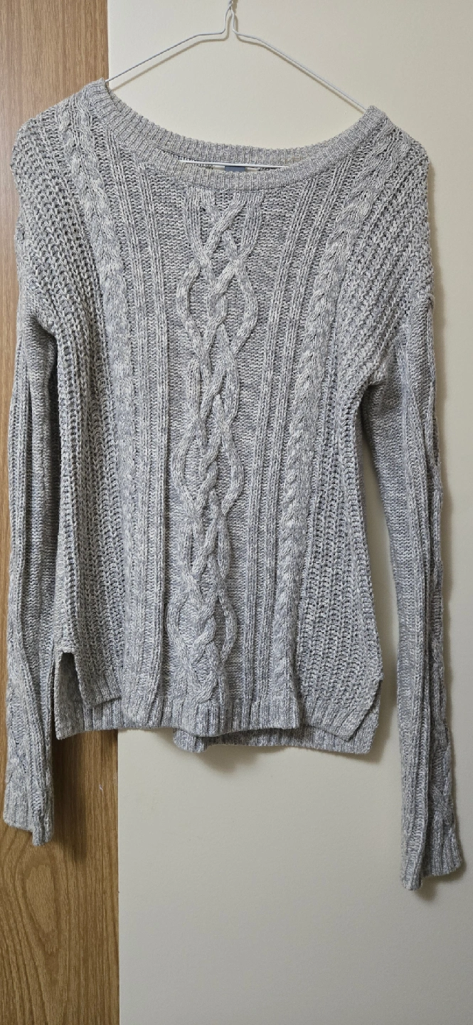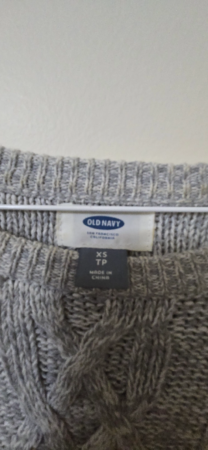 Selling a cute and cozy Old Navy cable knit sweater! It's a size XS and the colour is grey. Perfect for layering or wearing on its own!