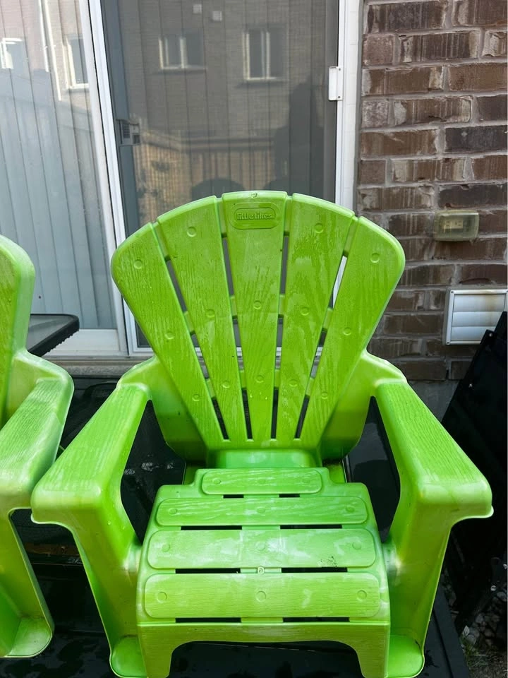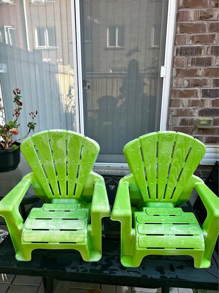 Set of 2 bright green kids’ Adirondack chairs. Perfect for outdoor play areas, patios, or backyards. Lightweight, durable, and easy to clean. Gently used and in great condition.