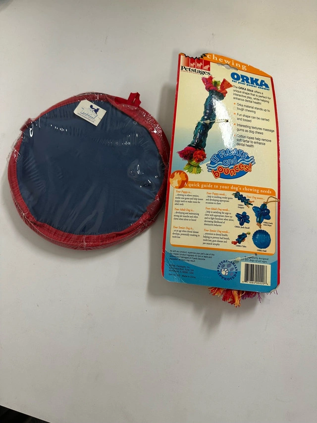Selling a brand new 2-piece set for dogs (also suitable for cats): 1. Deluxe Pop Open Dog Bowl • Pops open & stays open • Great for travel or outdoor use • Holds ¾ gallon of water • Folds flat for easy storage 2. Petstages ORKA Chew Toy • Tough & durable • Helps clean teeth and massage gums • Floats and bounces – great for fetch Payment: Cash accepted