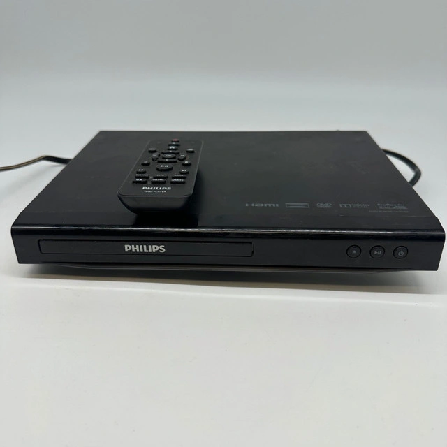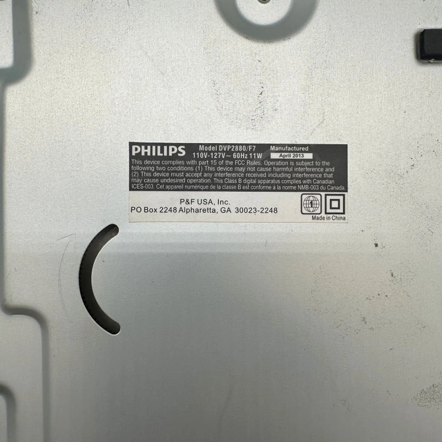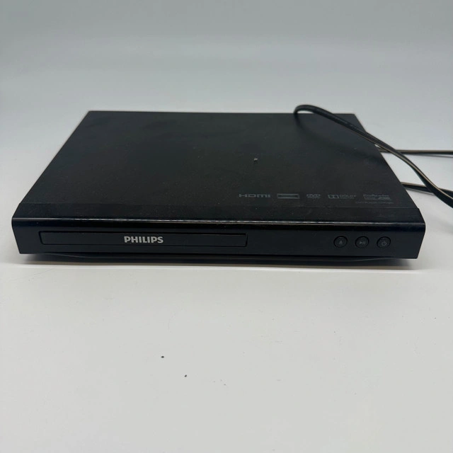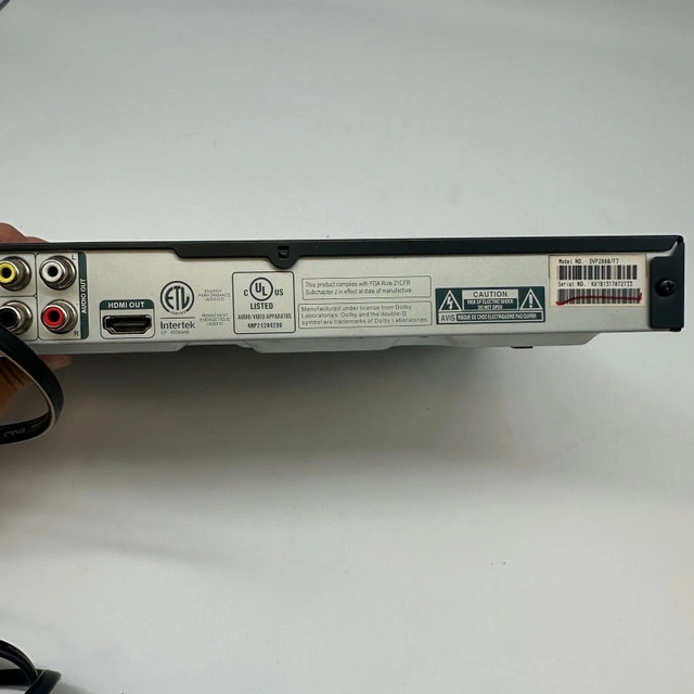 Philips DVD Player (Model DVP2880/F7) with remote control. Used – works for parts/repair (not fully tested, sold as-is). Manufactured: April 2013. Serial Number: KU1B137B722733. Connections: HDMI Out, Composite Video/Audio Out (RCA). Includes: Player + power cord + remote. Great for parts, repair projects, or replacement unit.