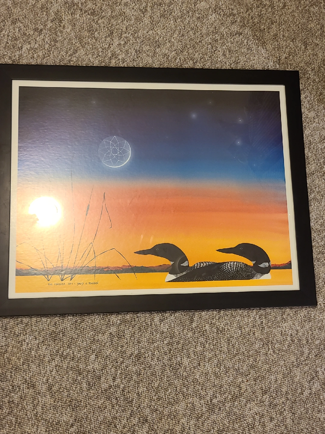 Selling a framed print titled 'The Forever Gift' by Indigenous artist David A. Johnson. It's a lovely piece! Purchased from Whetung Ojibwa Centre in Curve Lake, Ontario. Professionally framed. 66.5 cm x 52.5 cm From a pet-free, smoke-free home Porch pickup near Bathurst station