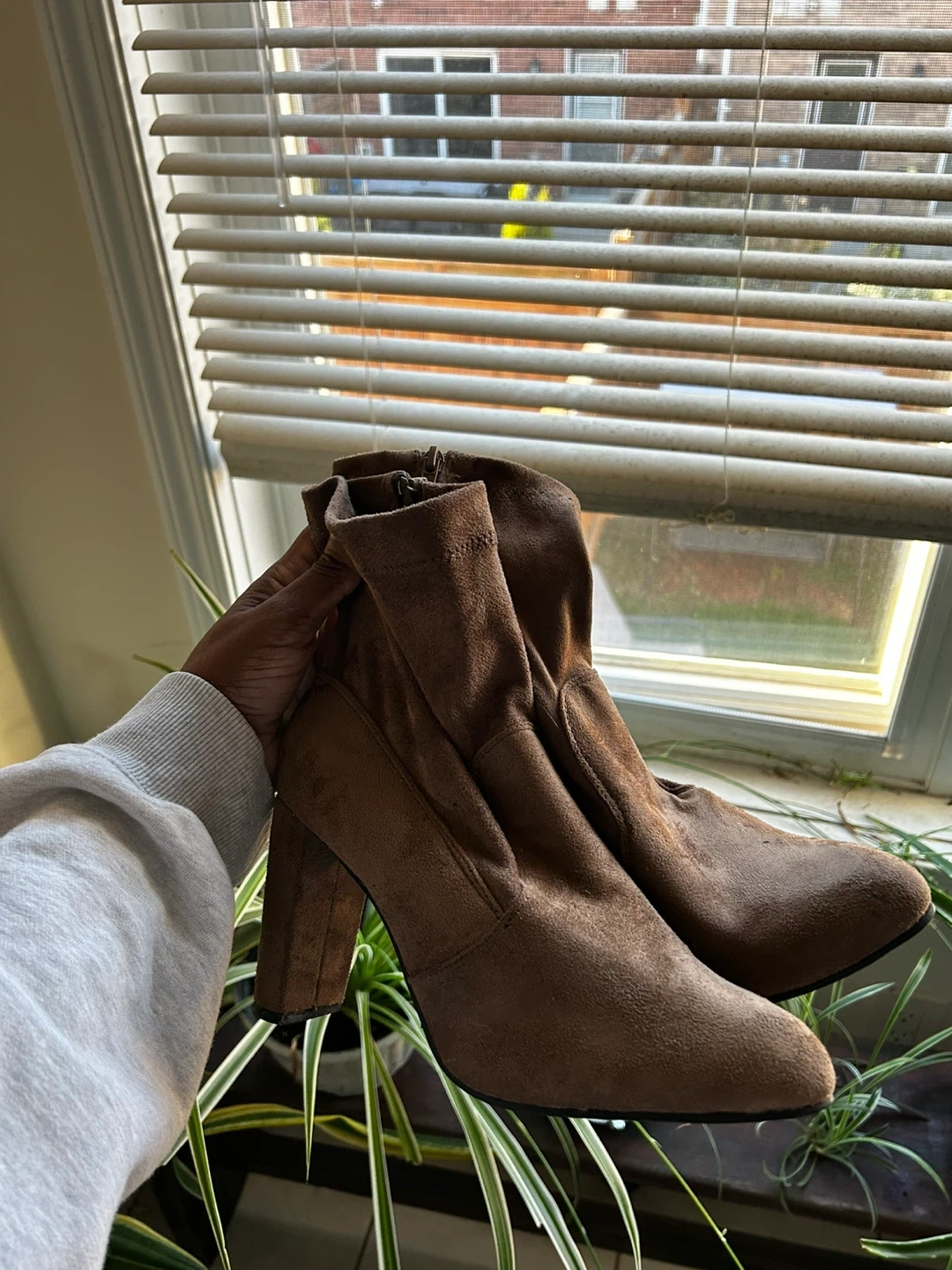 Selling a pair of stylish brown suede heeled ankle boots! They're perfect for adding a touch of sophistication to any outfit. These boots are in great condition and ready for a new home. They feature a comfortable block heel and a sleek design.