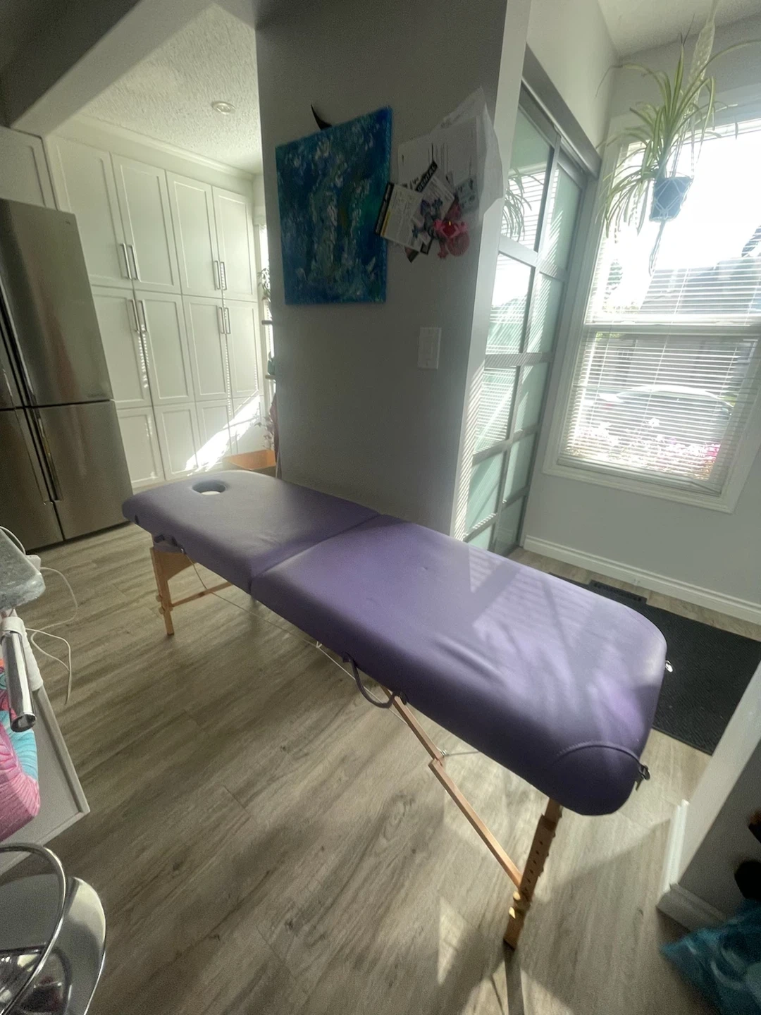 Selling a portable massage table by HOMCOM in purple. It comes with a user manual and several accessories as shown in the pictures. Great for anyone needing a massage table that's easy to transport and set up!