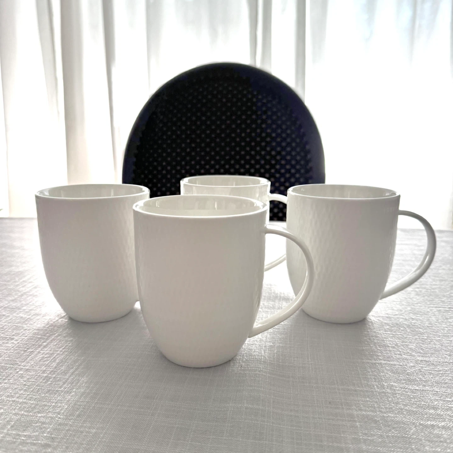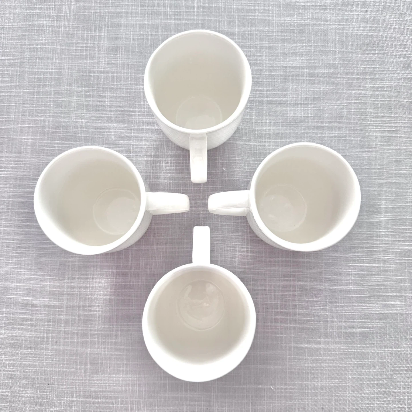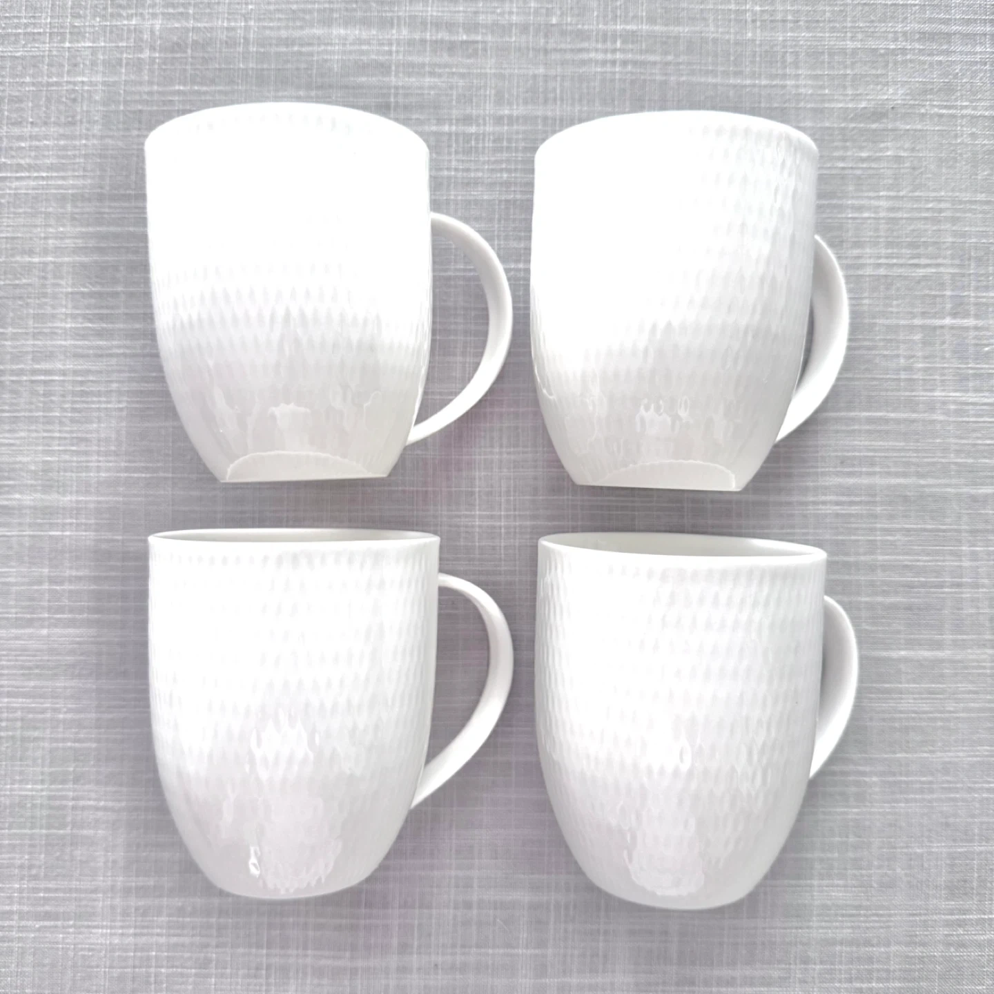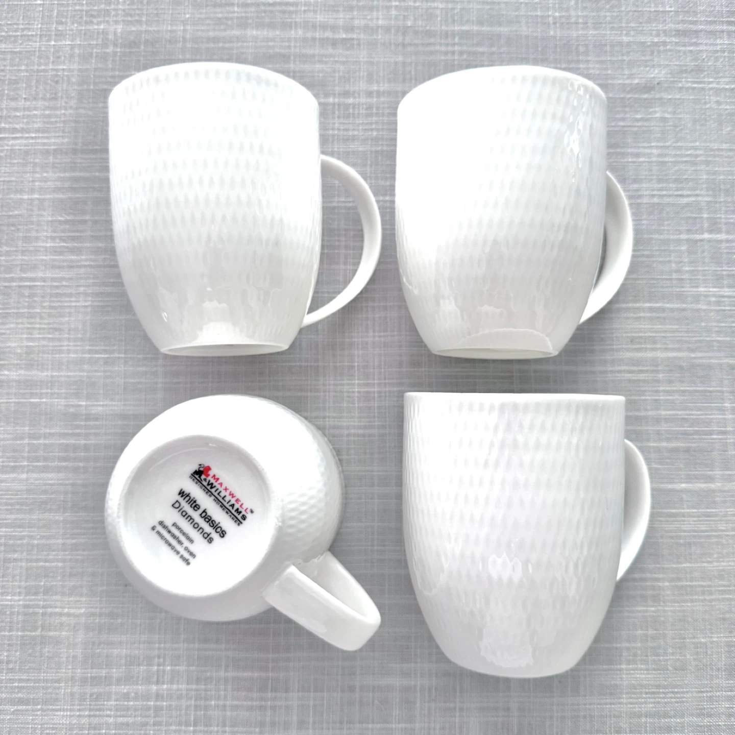 Set of 4 Maxwell Williams fine porcelain white mugs in the Diamonds pattern. No chips, cracks, crazing or staining. Dishwasher & microwave safe Pickup: 1. Avenue Rd & St Clair Ave condo (lobby or driveway) or 2. St Clair/Yonge subway station (outside) Sorry no deliveries, other meetup spots or holds (will hold only during your travel time for a confirmed pickup)