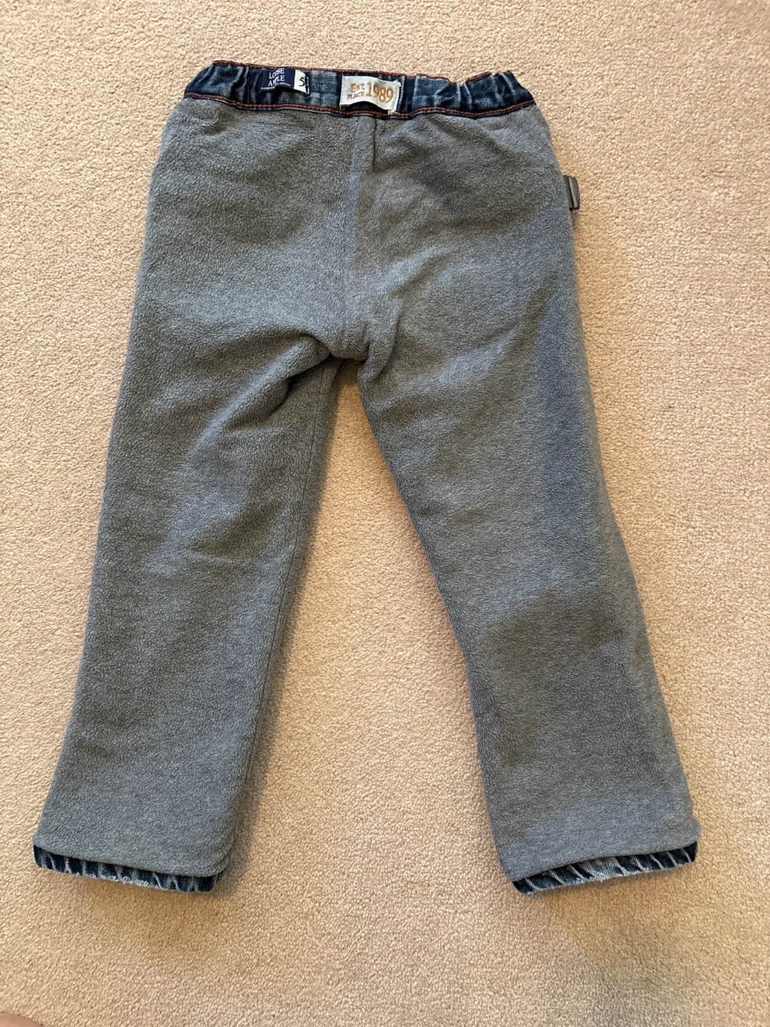 Selling a pair of boys' jeans, size 5.They are in great condition and have an elastic waistband for a comfy fit. The jeans feature a classic denim look with a soft, grey terry cloth lining.