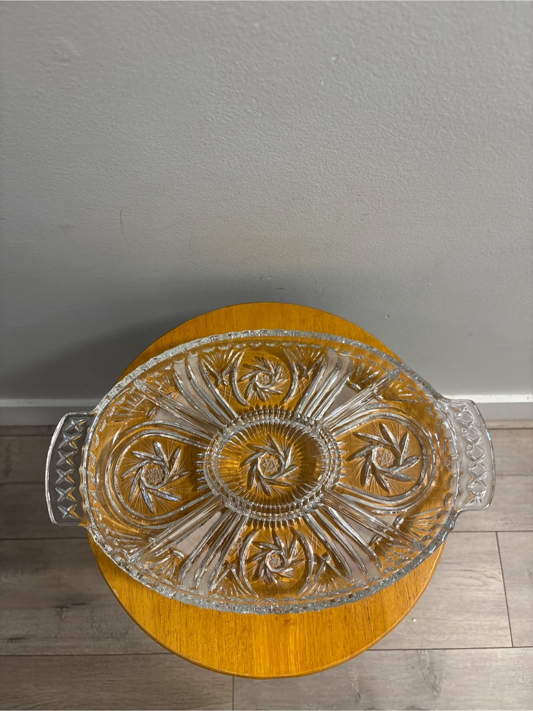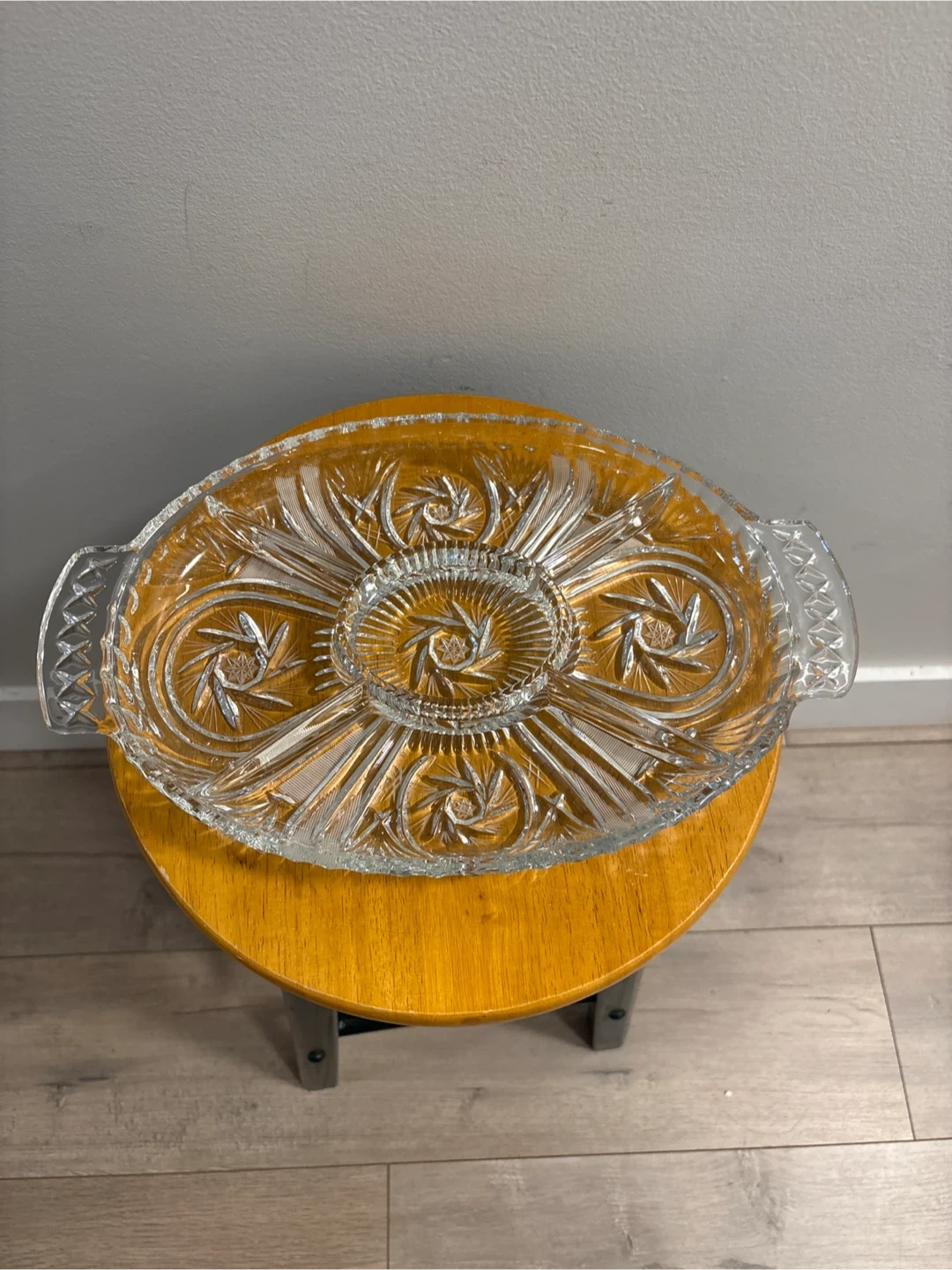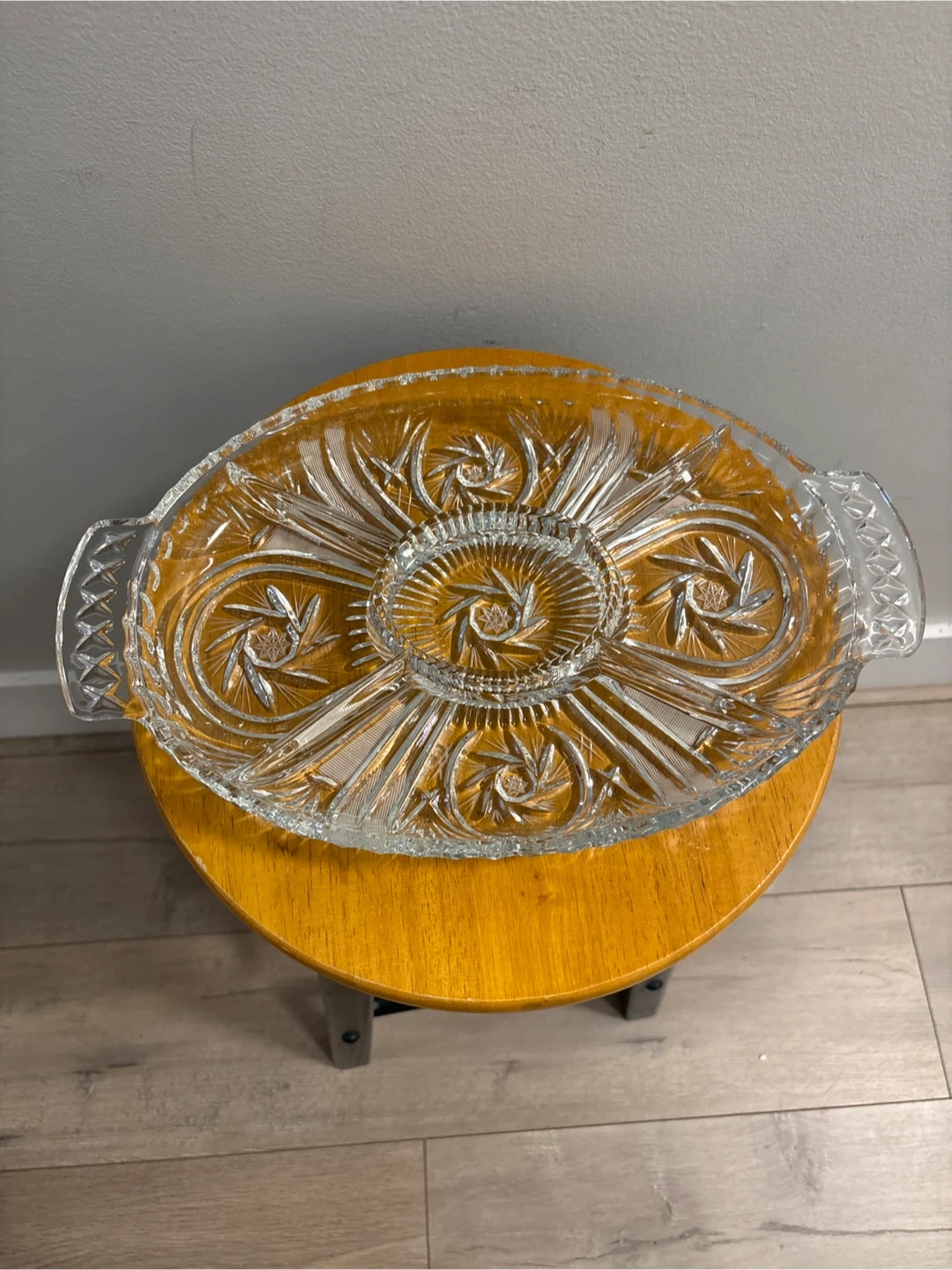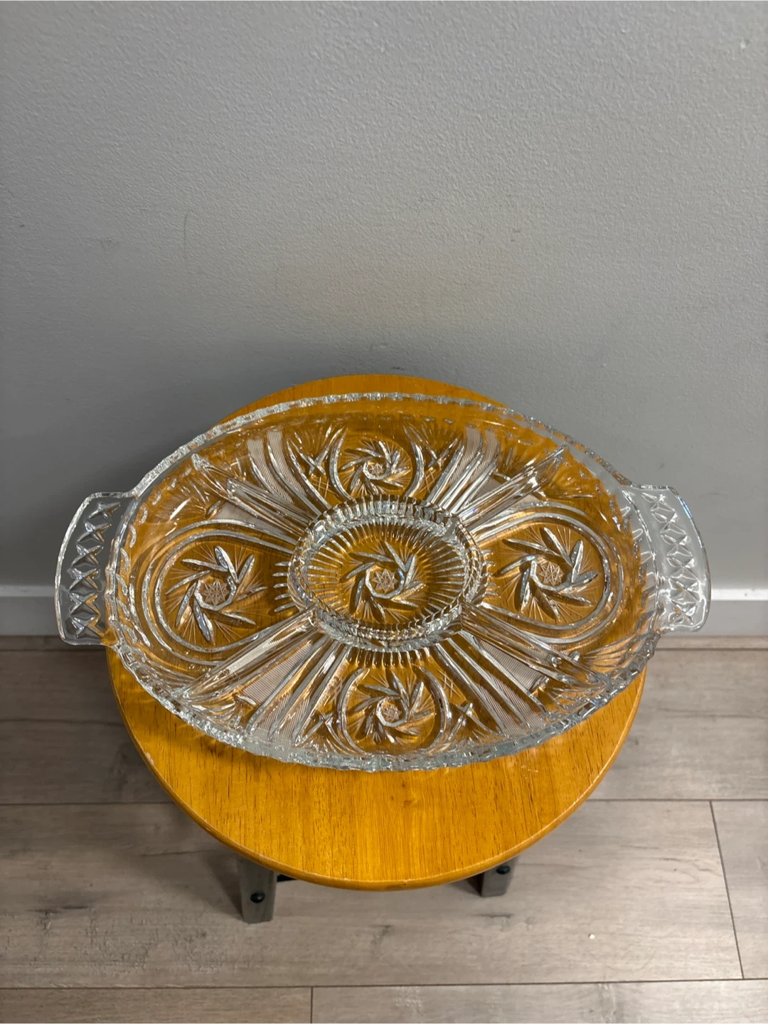 Selling a beautiful vintage clear glass serving platter! It's perfect for serving appetizers or desserts at your next gathering. The platter features an intricate starburst design and convenient handles for easy carrying. It's in great condition and ready to add a touch of elegance to your table