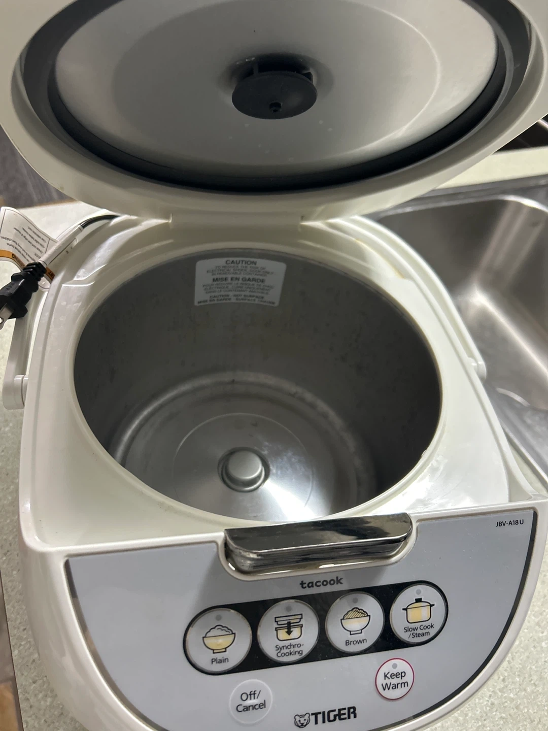 Selling a Tiger Tacook rice cooker, model JBV-A18U. It's in good condition and ready to help you make delicious rice dishes! It features multiple cooking options, including Plain, Synchro-Cooking, Brown, and Slow Cook/Steam. You just need to buy the inner pan
