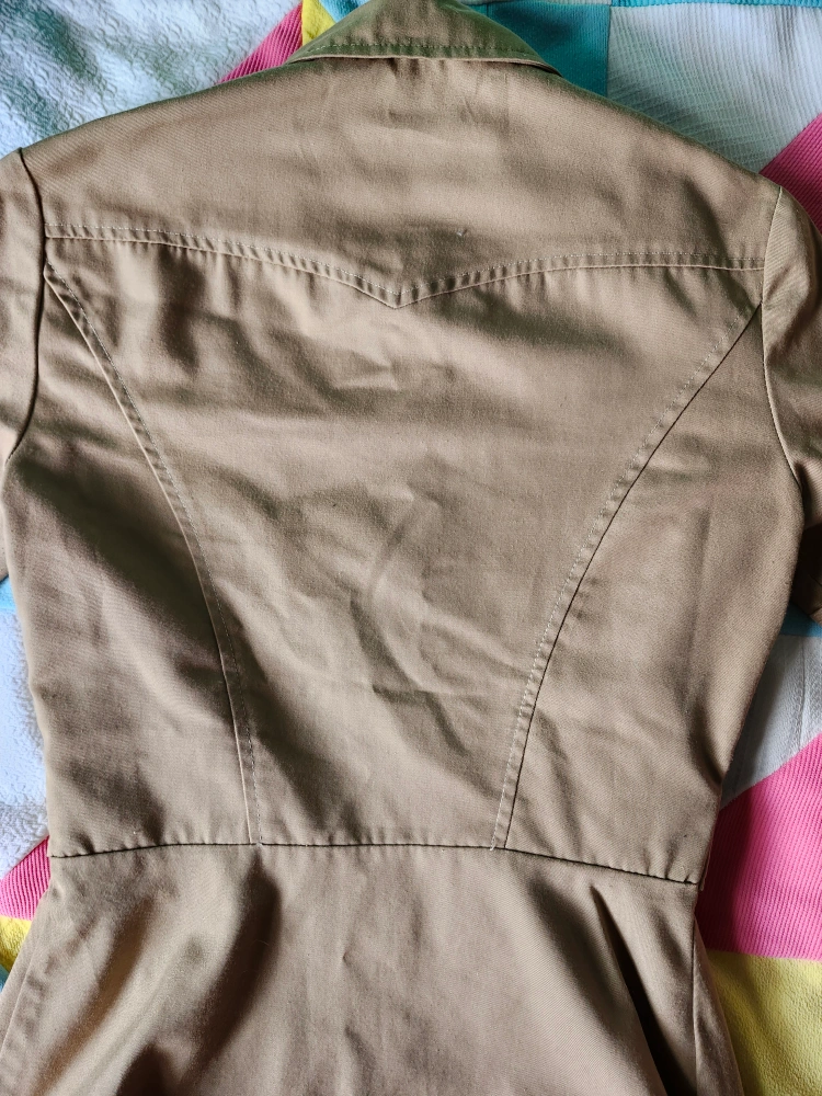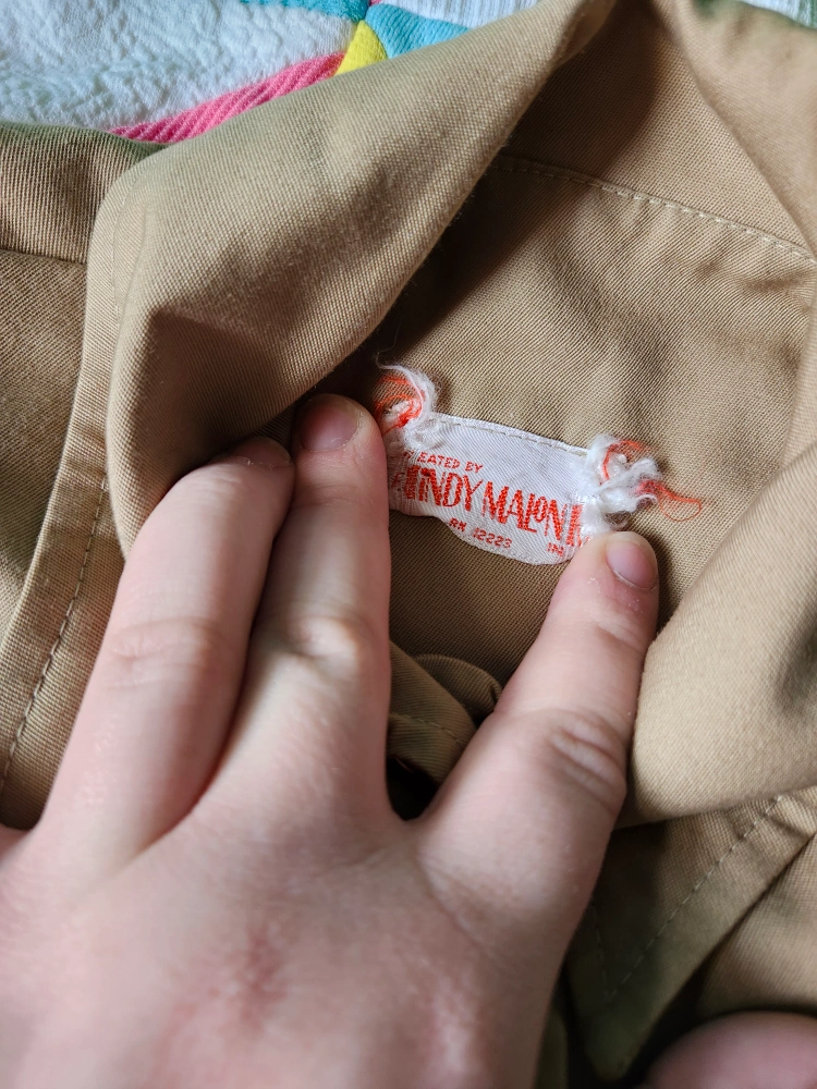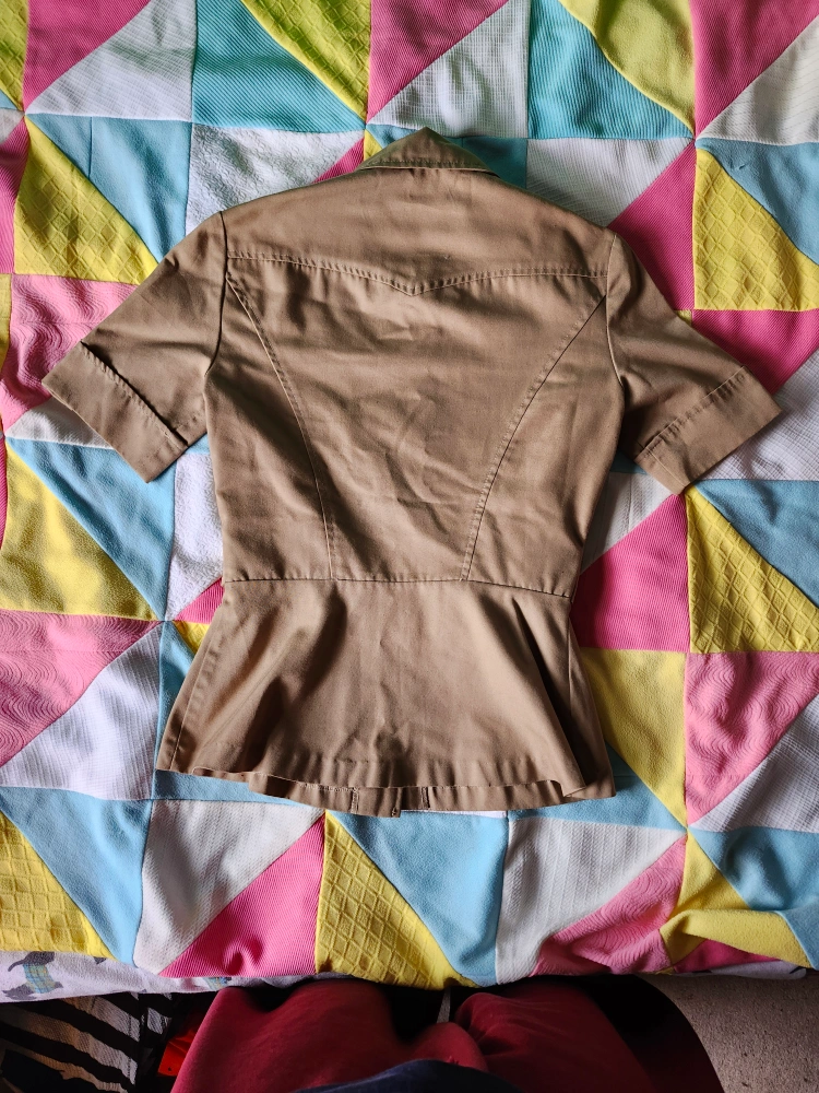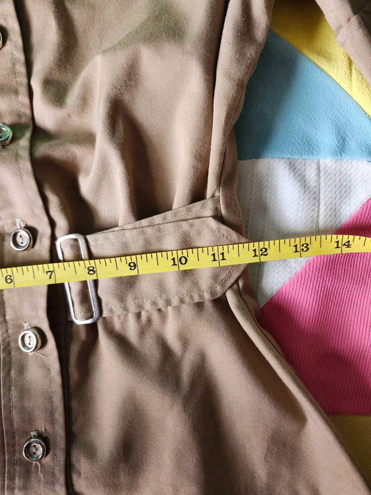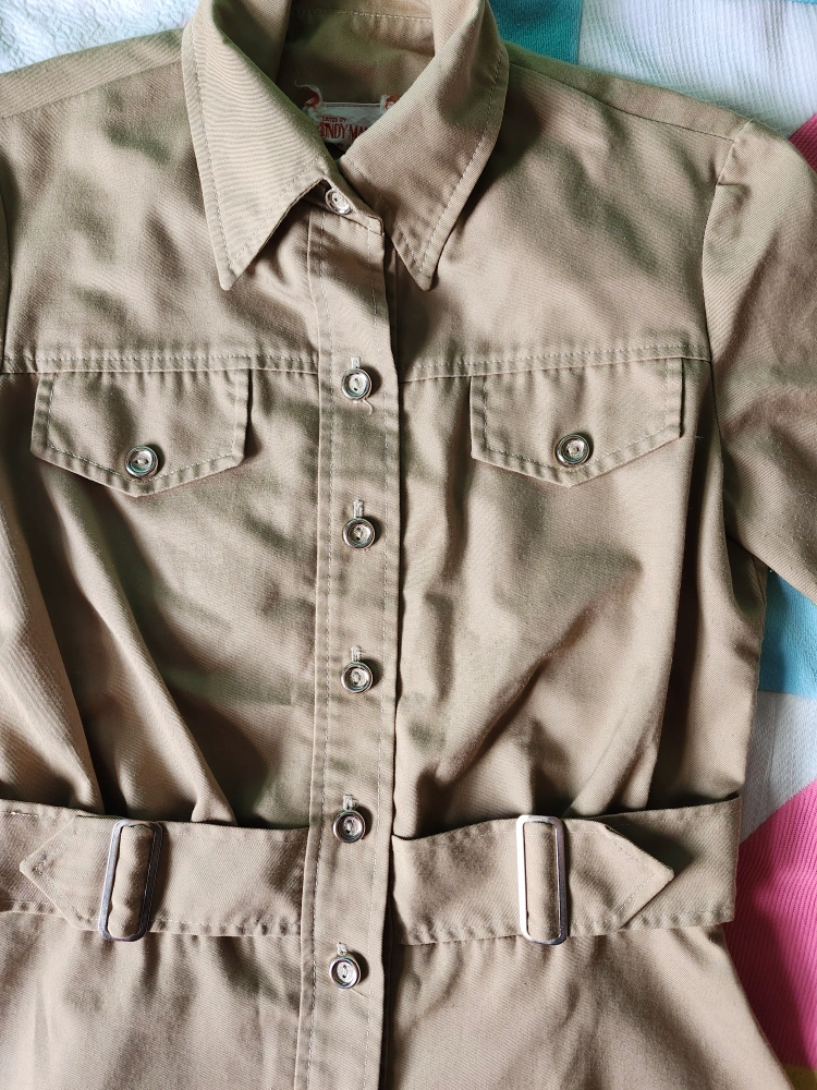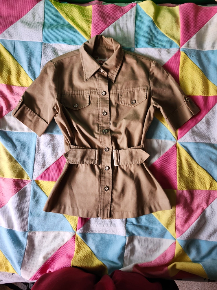 Tan and brown 70s military-inspired button-up top with belted waist this super cute 70s safari/military inspired top kinda gives 00s to me?? just picture it with some capris, wedges and a giant purse ✨️ by Mindy Malone no label size, pit to pit laying flat is just under 18in. the waist straps make the shirt adjustable. at its widest, laying flat, it is 13.5in. at it's smallest the waist, laying flat, is just over 11.5in item is in great used condition with no flaws or stains that I noticed. only signs of age I found were the fraying on the label