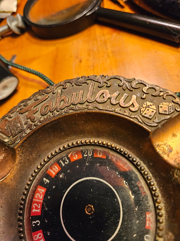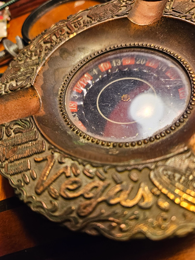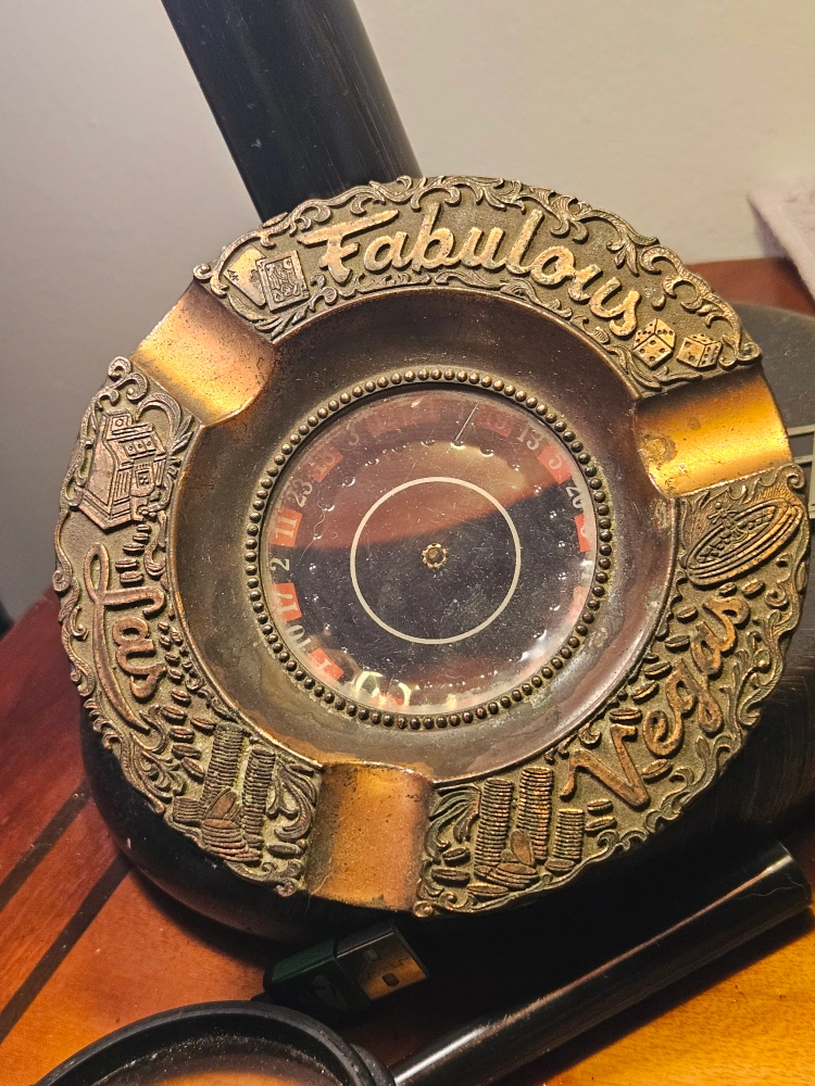 25Selling a vintage ashtray with a Las Vegas theme. It has a roulette wheel design in the centre and says "Fabulous Las Vegas" around the rim. It's a unique piece for any collector!