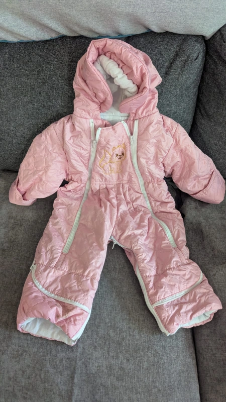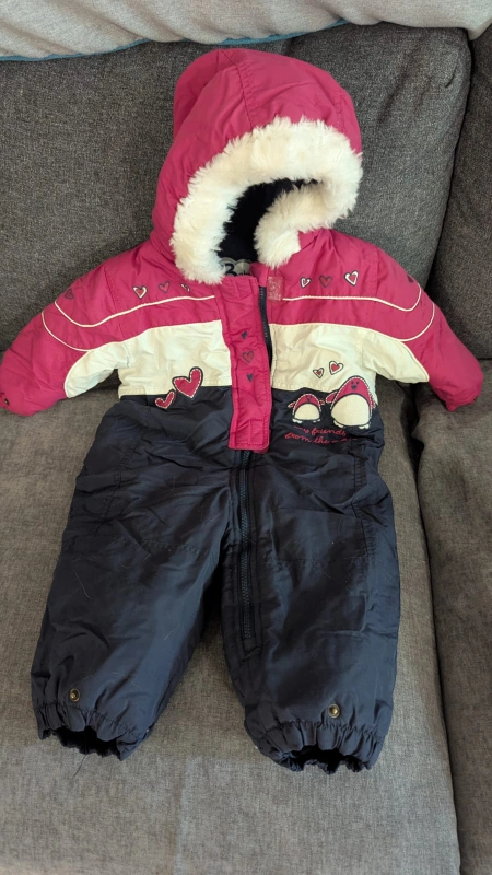 Selling a bundle of two baby snowsuits! One is pink with a cute animal design, and the other is navy and white with heart details. Both are in good condition and ready to keep your little one warm this winter. 6-15 months depending on the size of your baby. Price for both.