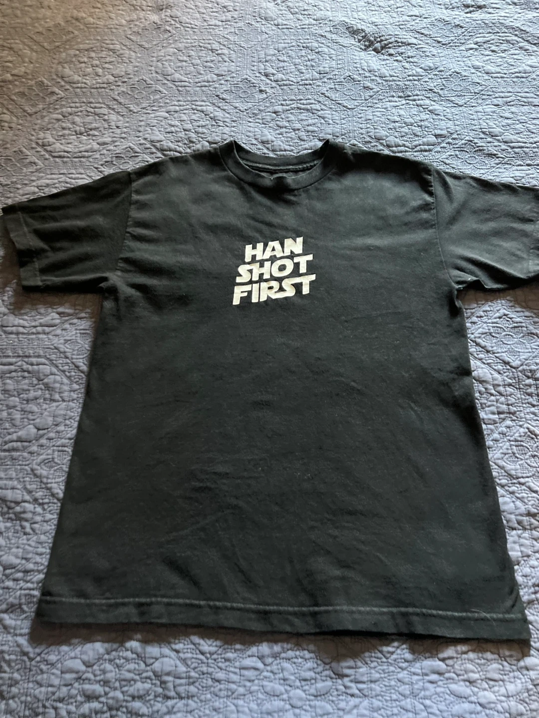 Selling a ThinkGeek T-shirt with the text "Han Shot First" on it. It's a size medium and made of 100% cotton. Perfect for any Star Wars fan!