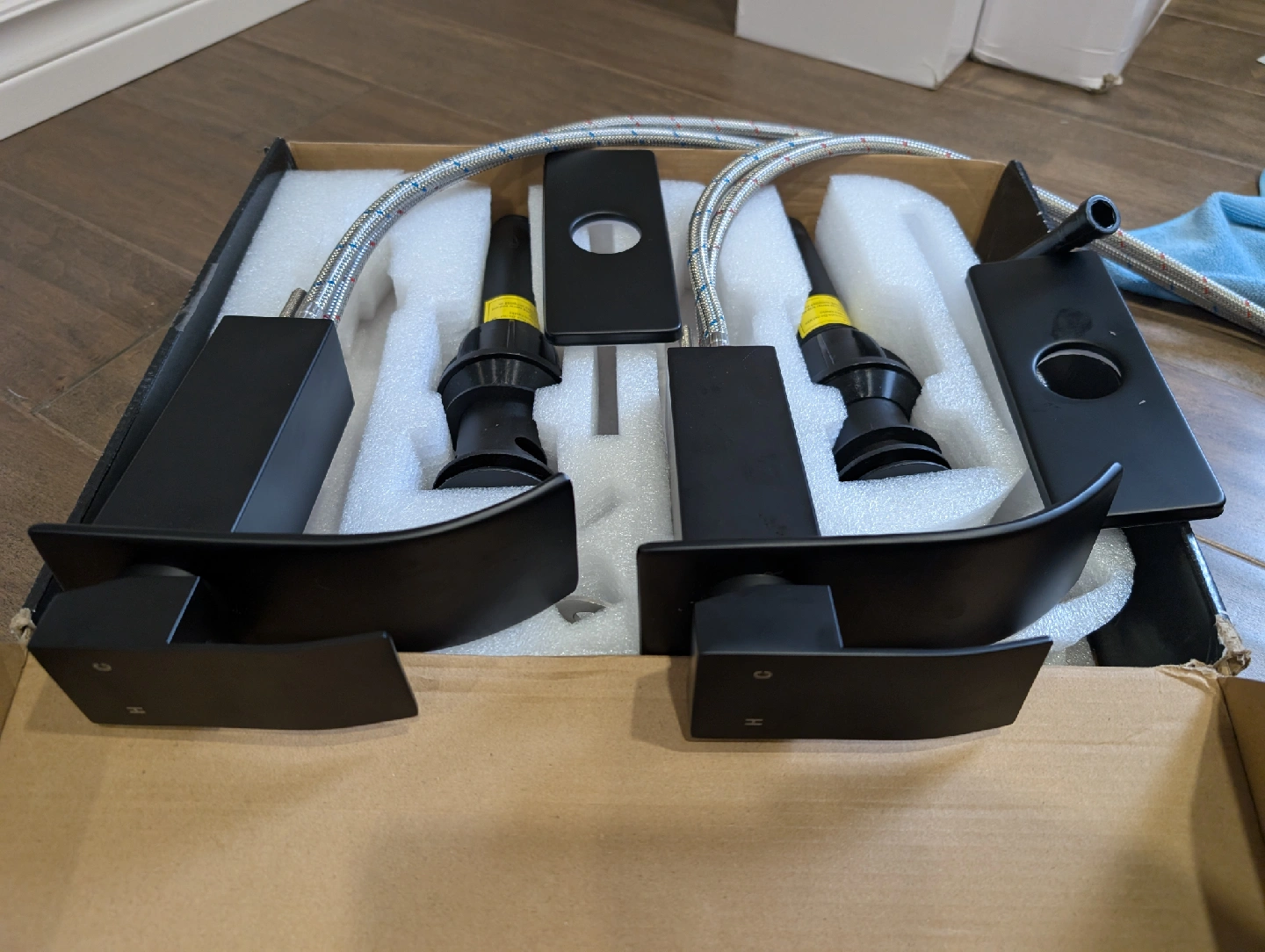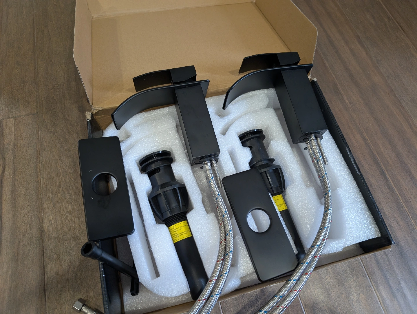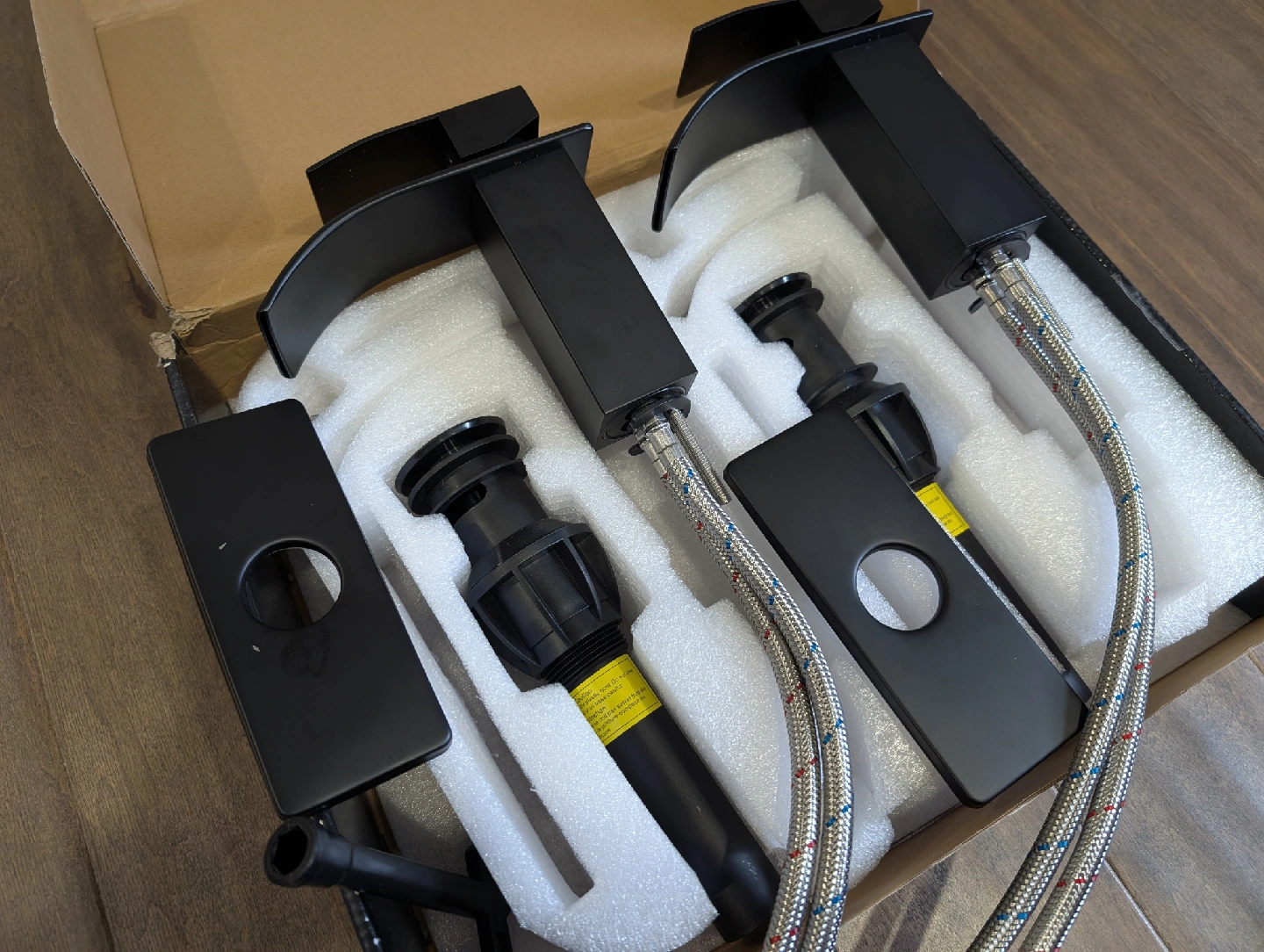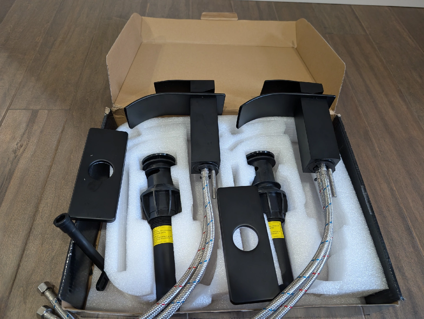 Brand new matte black bathroom waterfall faucets for sale. Single hole, single handle basin, plate and pop-up drain included, set of 2, $110 FIRM. faucet, water, reno, vanity, counter, water, bathroom, sink, renovation, hose, plumbing, kitchen, drain, shower, tub, bath, bathtub, swivel, pull down, pull out, spray, nozzle, handle, Moen, Delta, dishes, column, tower, massage, jets, LED, temperature, valve, rainfall, waterfall, wand, spout