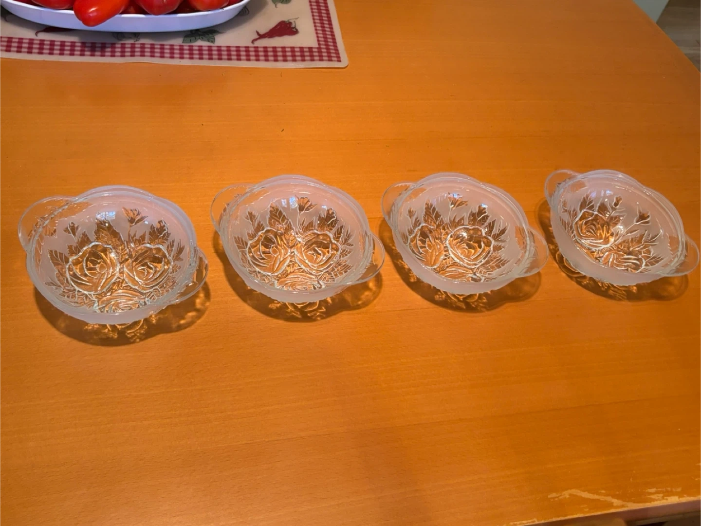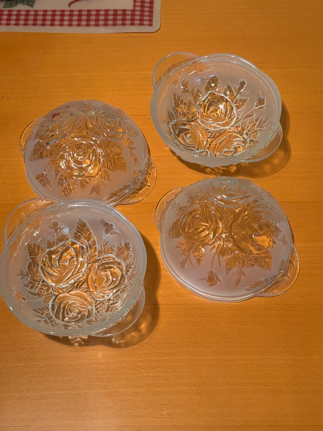 Selling a set of four frosted glass bowls. They feature a beautiful rose design and are perfect for serving small dishes or desserts. **Pristine condition** and would add a touch of elegance to your table setting Pick up and cash only pls Rough specs: Diameter: 5.5 inches Depth: 2.5 inches
