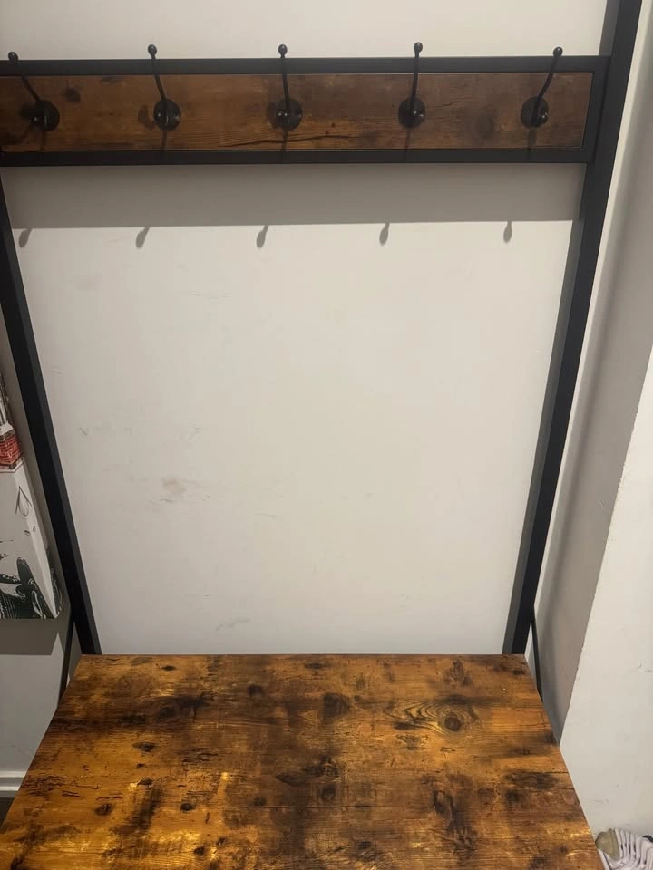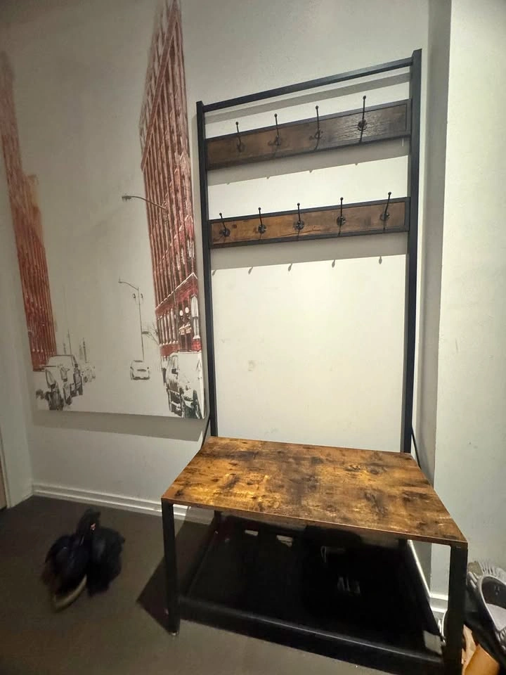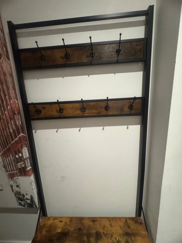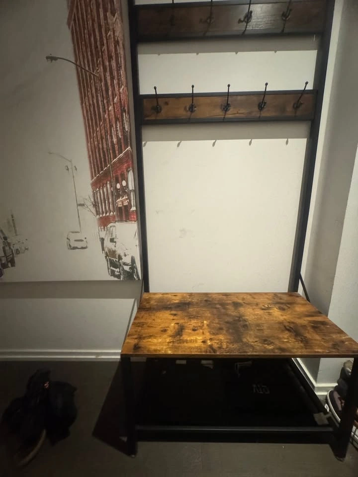 Stylish and functional hall tree with a rustic wood finish and sturdy black metal frame. Includes: 2 rows of coat hooks (8 total) Bench seat for putting on shoes Lower shelf for storage Purchased new in 2024 for $110 (Staples). Still in excellent condition, very sturdy, no damage. ๐ Pickup ๐ฒ Price: $75