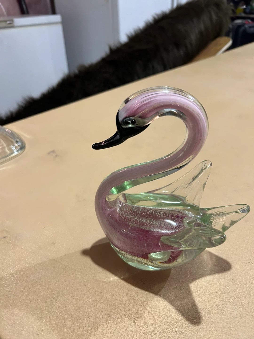 A beautiful glass swan figurine. It has a lovely pink and clear colour scheme. It's in great condition and would make a lovely addition to any home