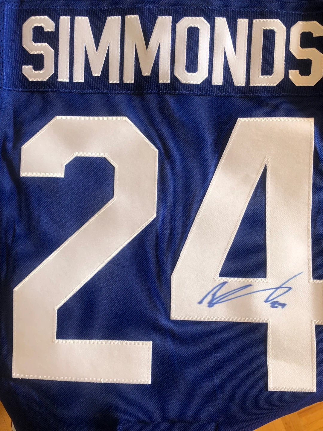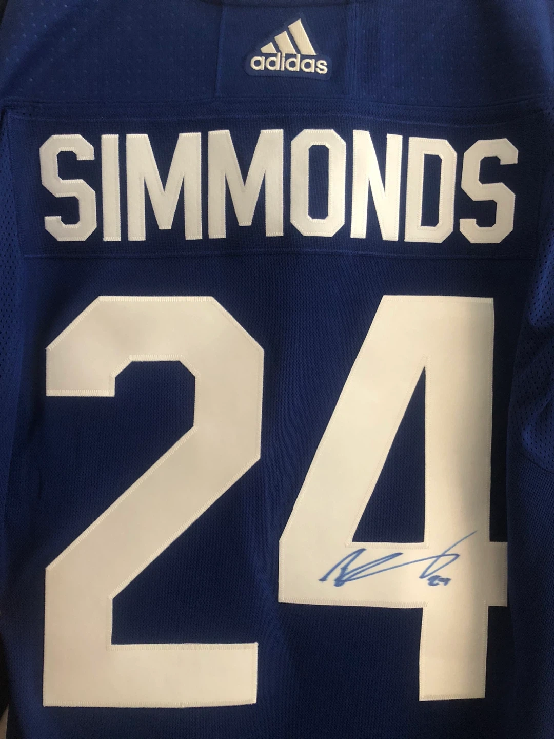 Selling a never worn Toronto Maple Leafs “Signed”by Simmonds jersey by Adidas. It's a size 52 and features the name SIMMONDS and number 24 on the back. The authentic jersey is blue and white with the Maple Leafs logo on the front. Originally price tag is $199.99 I won this signed jersey.