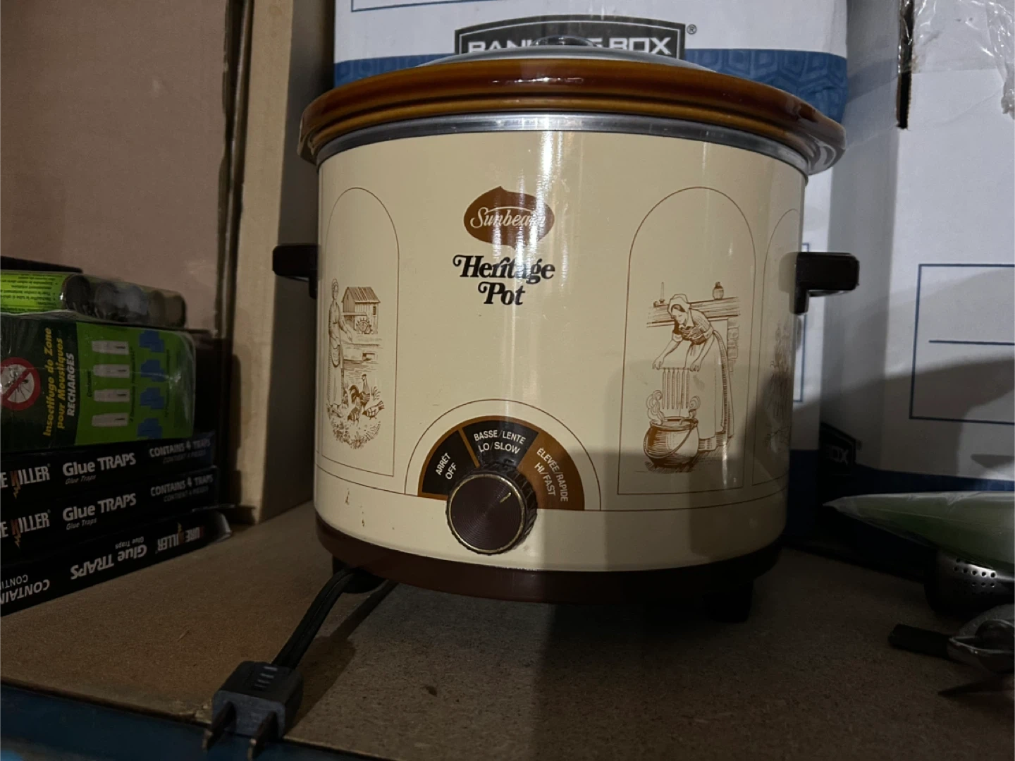 Selling a Sunbeam Heritage Pot slow cooker. It has a charming vintage design with illustrations. Perfect for making soups, stews, and more!