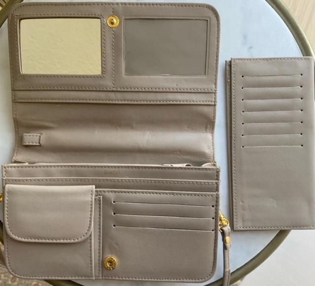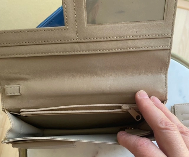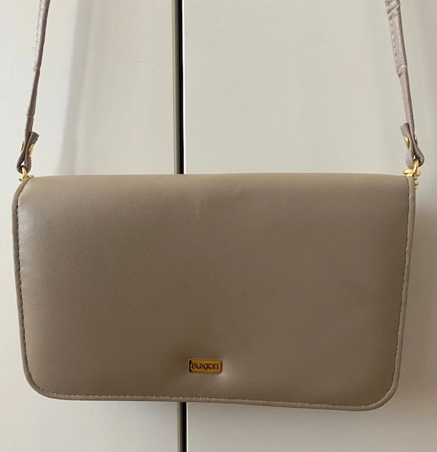 Buxton wallet/purse with detachable strap 7 1/4" W x 4.5" H x 1.5" base exterior zippered pocket, interior mirror , interior photo slot 3 card slots and change pocket removable 7 card slot compartment cash only pick up College or Wellesley subway