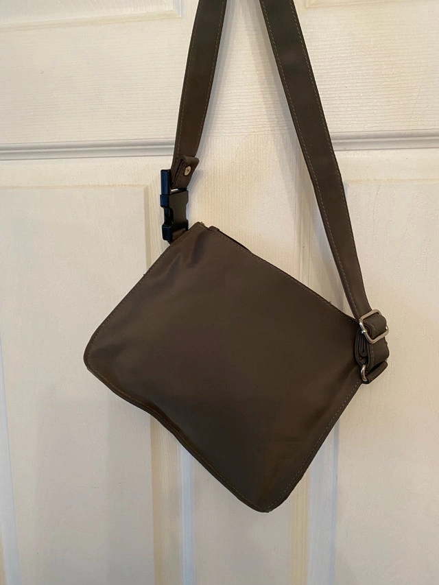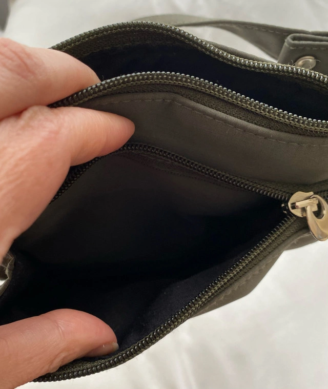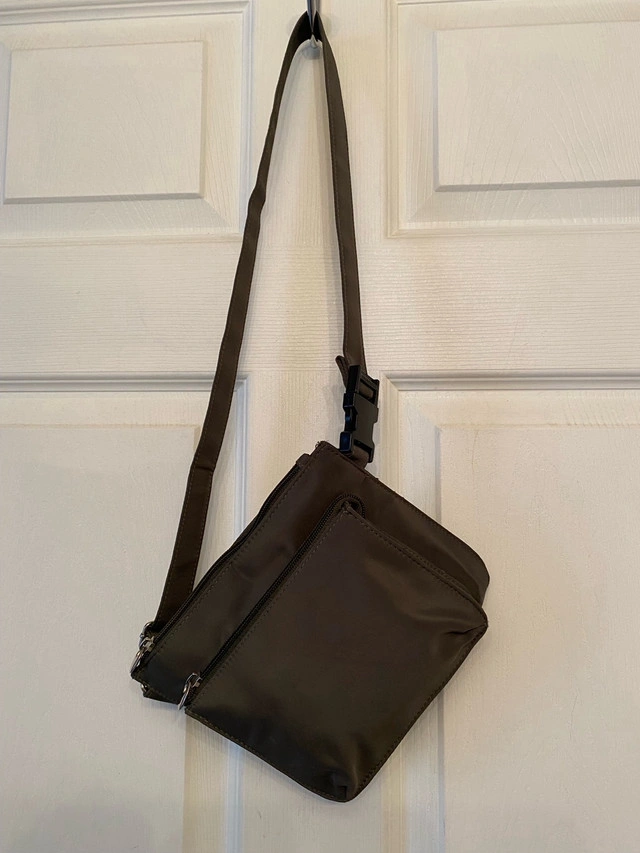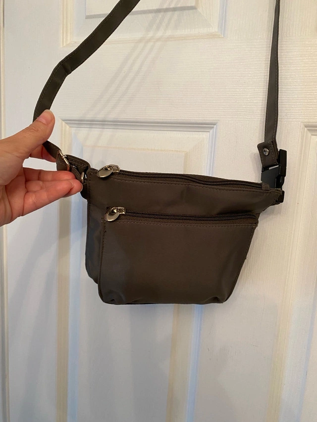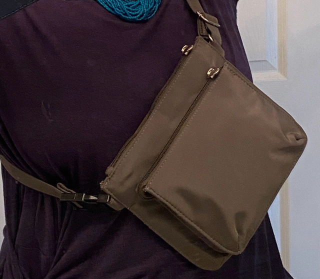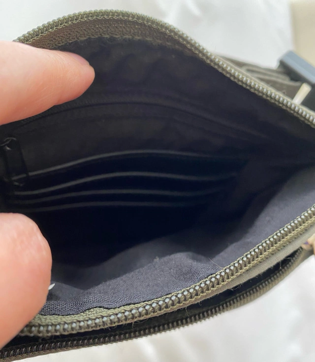 Hunter green nylon waist/chest bag - 8” wide x 7” high - 3 interior card slots - exterior zippered pocket - adjustable strap - price firm (cash only) - pick up at Wellesley or College subway