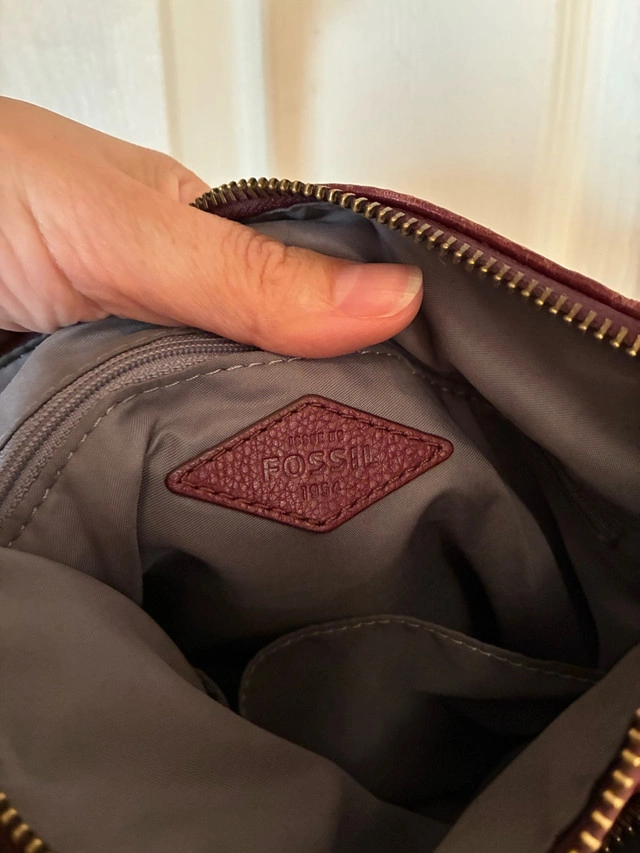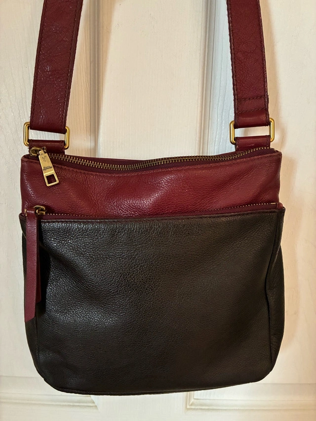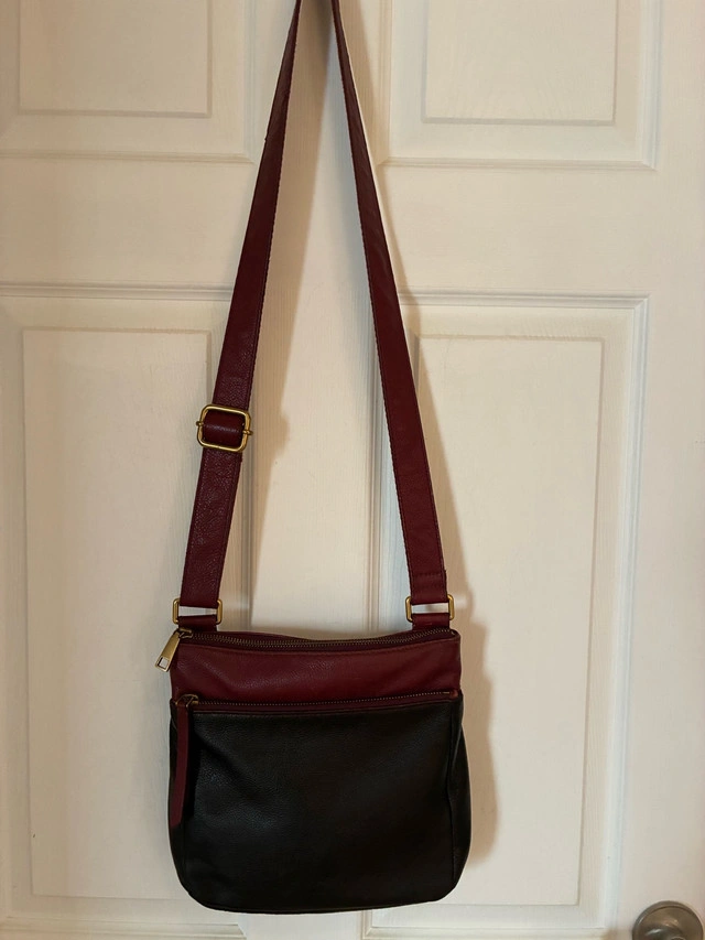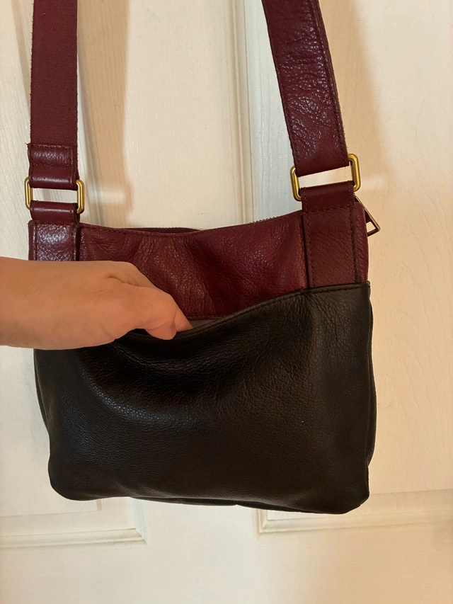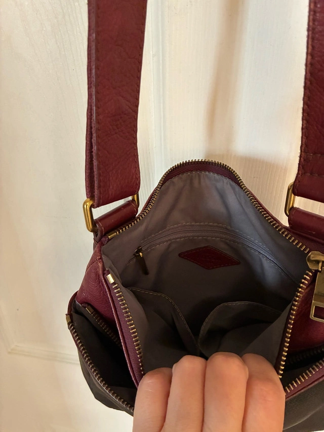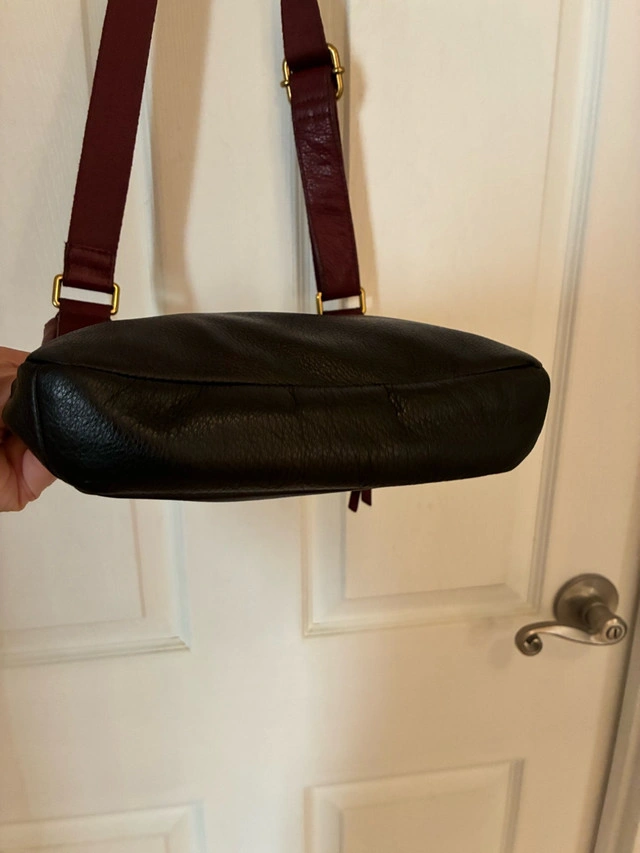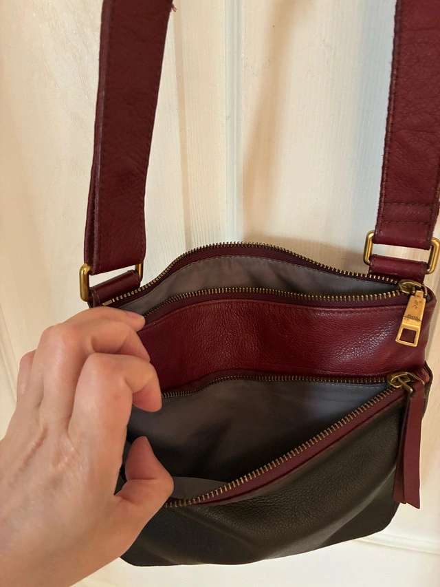 Fossil Black and burgundy crossbody - 2 exterior and 3 interior pockets - adjustable strap - 10” wide x 9” high x 2.5” base - Firm price— cash only - pick up Wellesley or College subway