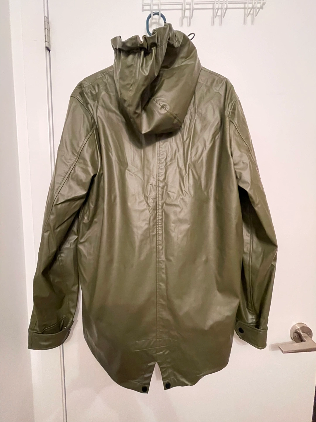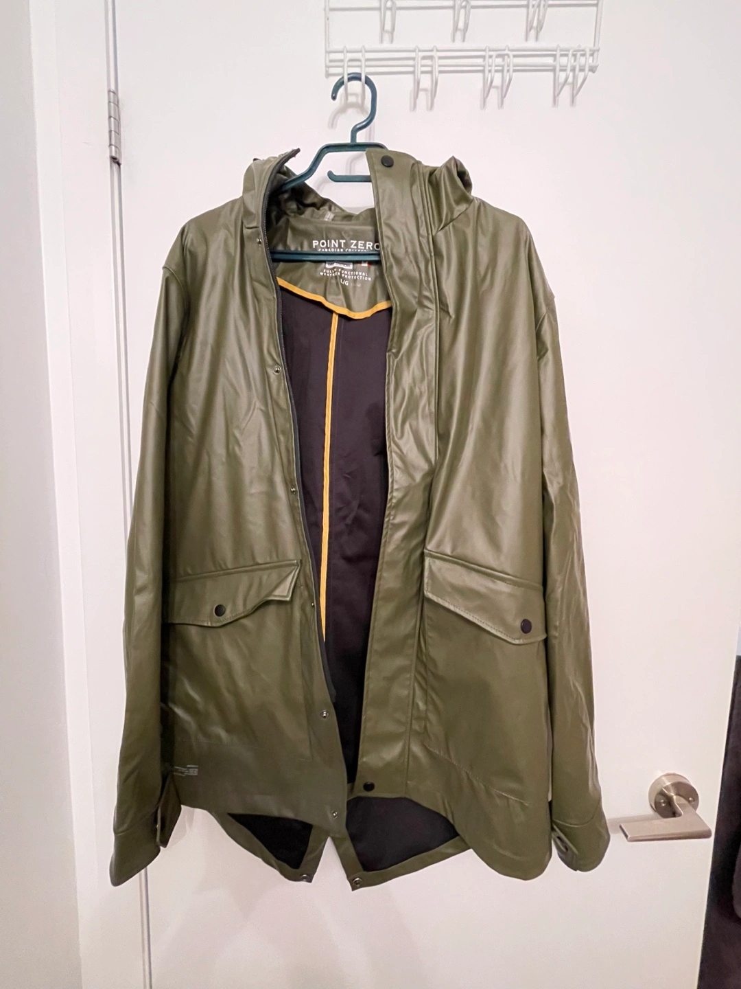 Selling a men’s Point Zero large rain jacket in olive green! It's in great condition and perfect for rainy days. The jacket features a hood and functional pockets, making it both stylish and practical Pickup at King street east and Sherbourne