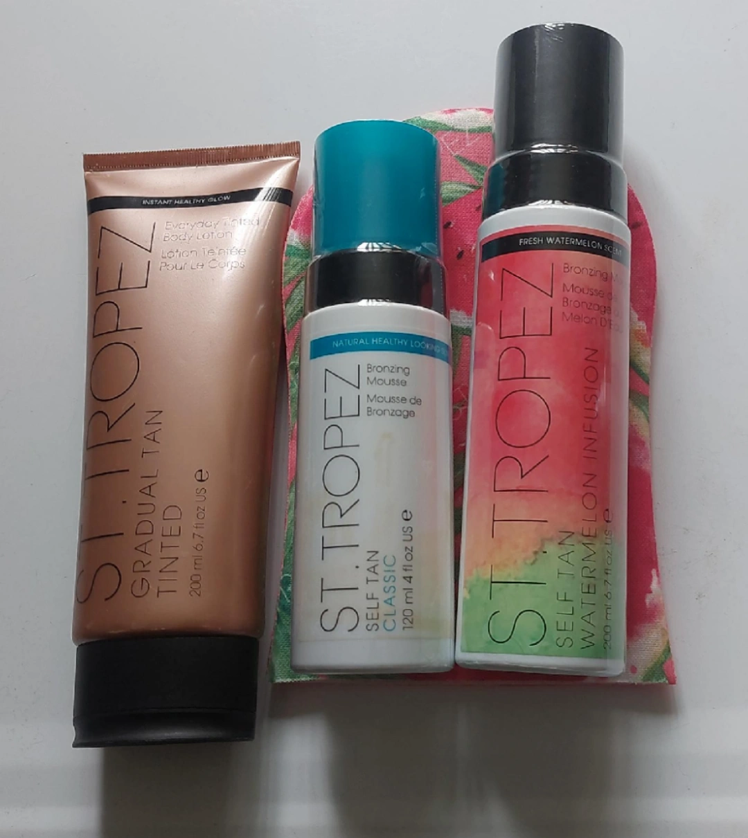 Selling a set of St. Tropez tanning products! Includes: - St. Tropez Gradual Tan Tinted Body Lotion (200ml) - St. Tropez Self Tan Classic Bronzing Mousse (120ml) - St. Tropez Self Tan Watermelon Infusion (200ml) Get your glow on!