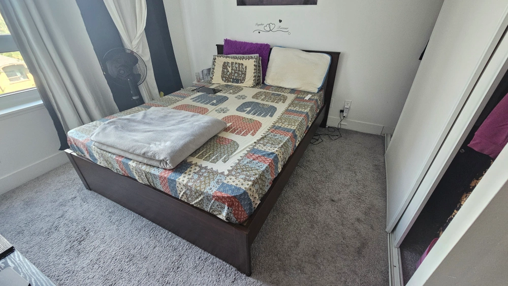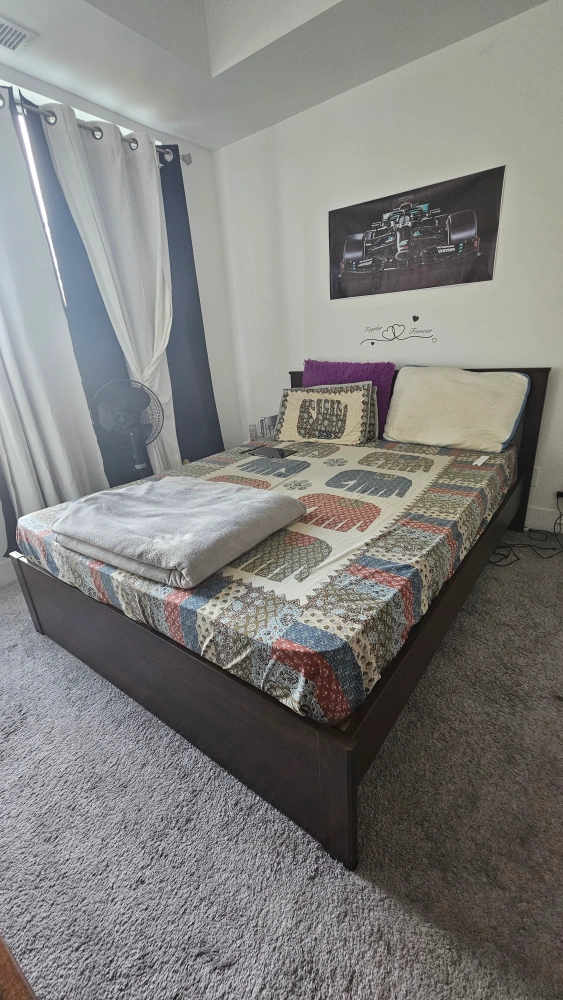 King size bed frame without mattress in good condition. The bed frame is dark brown and great for a guest room or small space. Available for PICKUP ONLY with Instruction Manual and parts. (Already Disassembled) Address: 7 Kenaston Gardens, North York Contact Immediately.