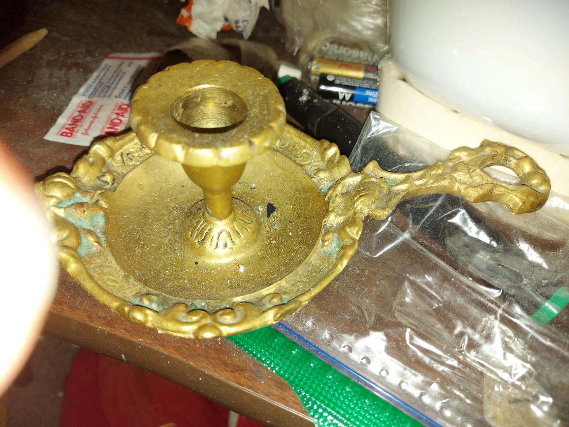 Selling a vintage brass candle holder. It has a handle and ornate detailing around the edge. It shows some signs of age and use, adding to its antique charm