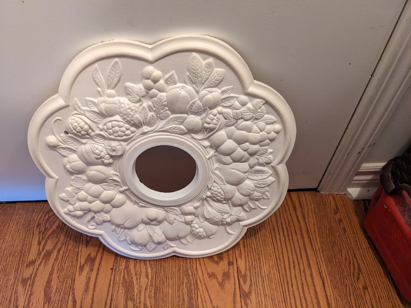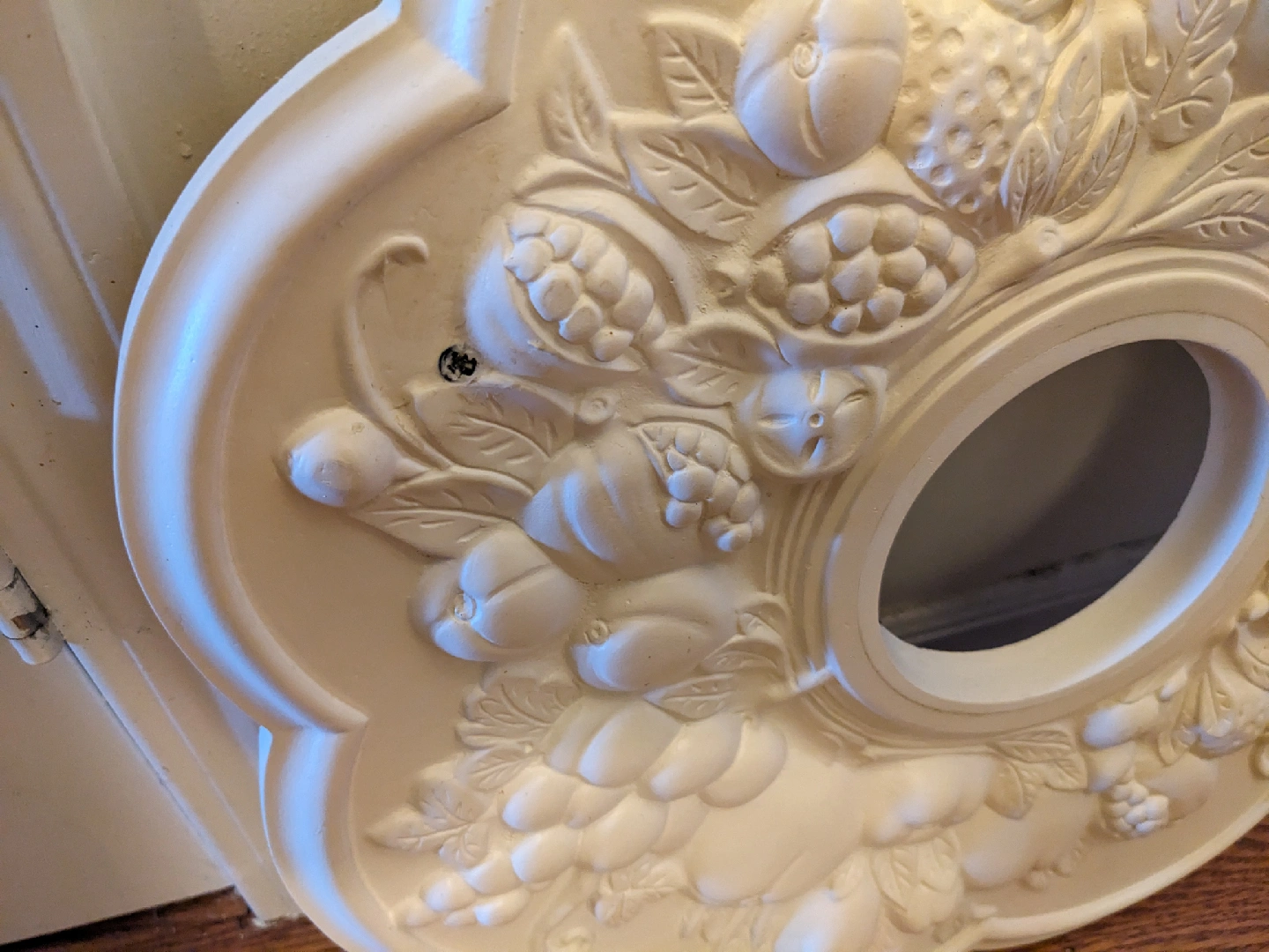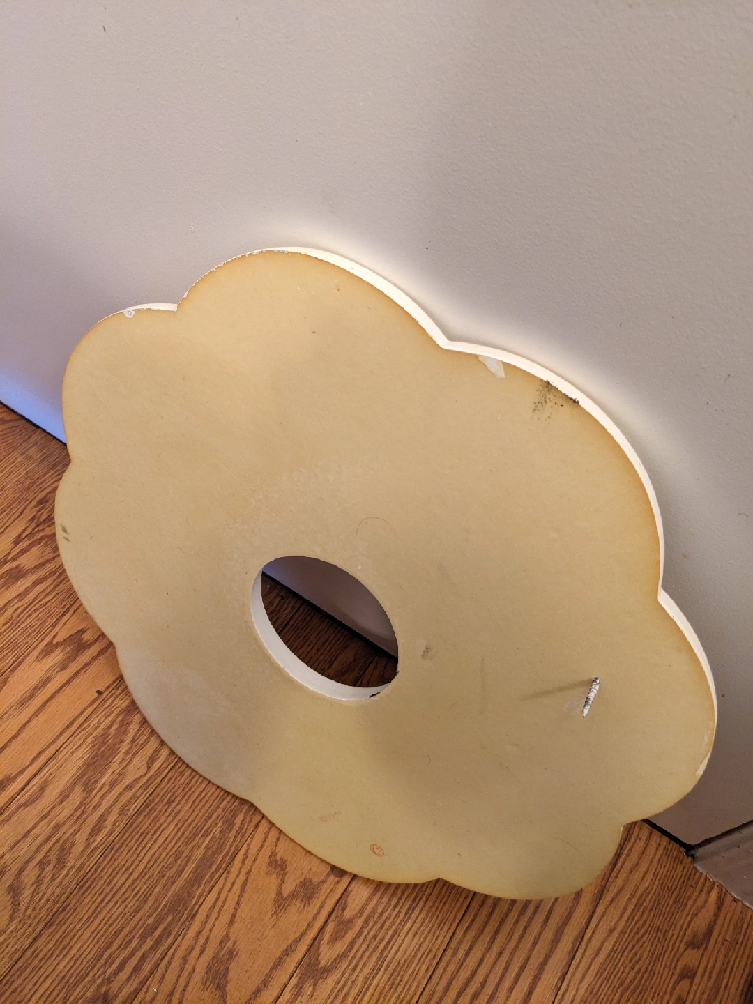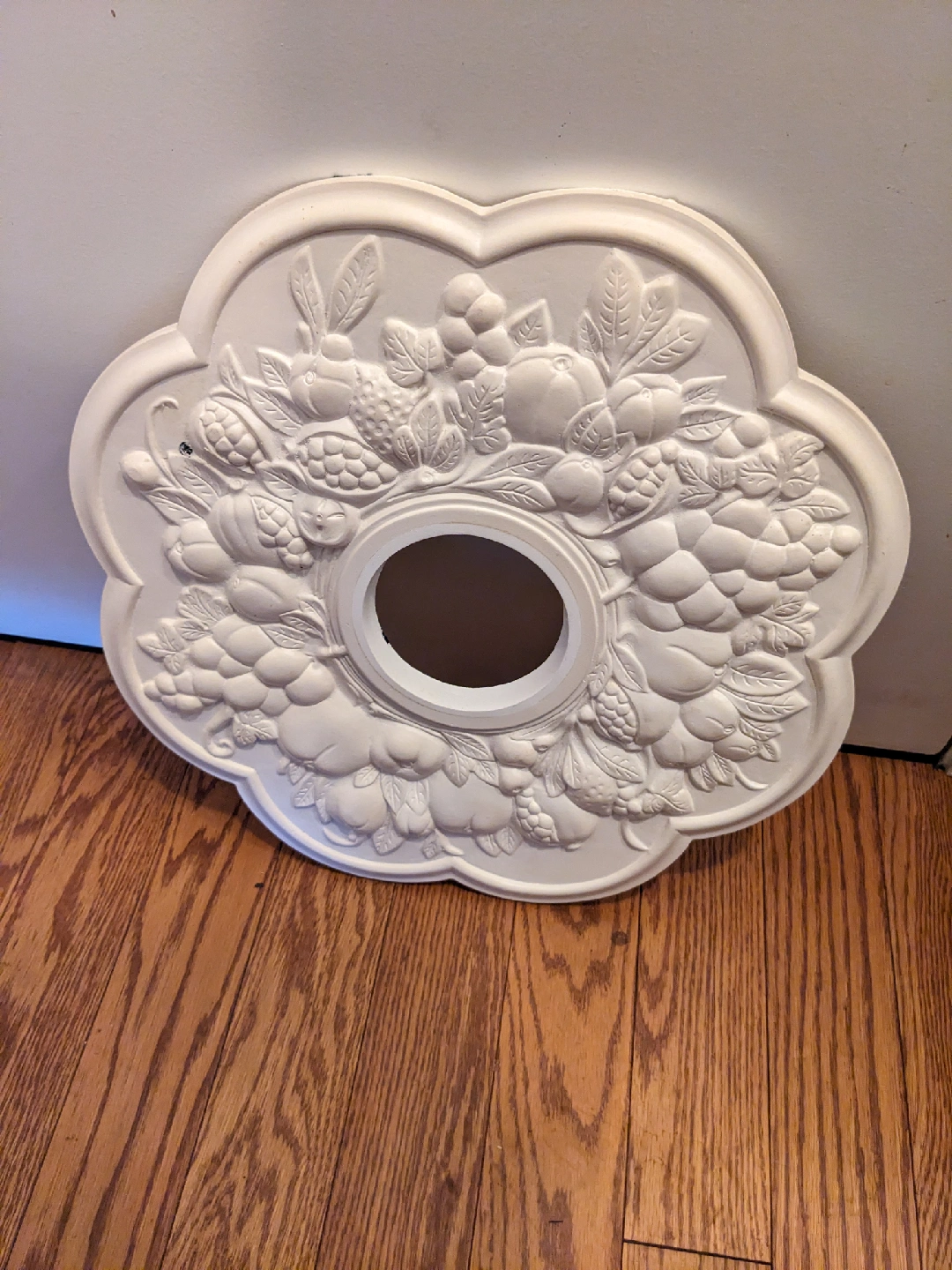 Selling a ceiling medallion with a floral design. It's off-white and has a hole in the middle for light fixture wiring. It shows some signs of wear, but it's still in good shape and ready to be installed!