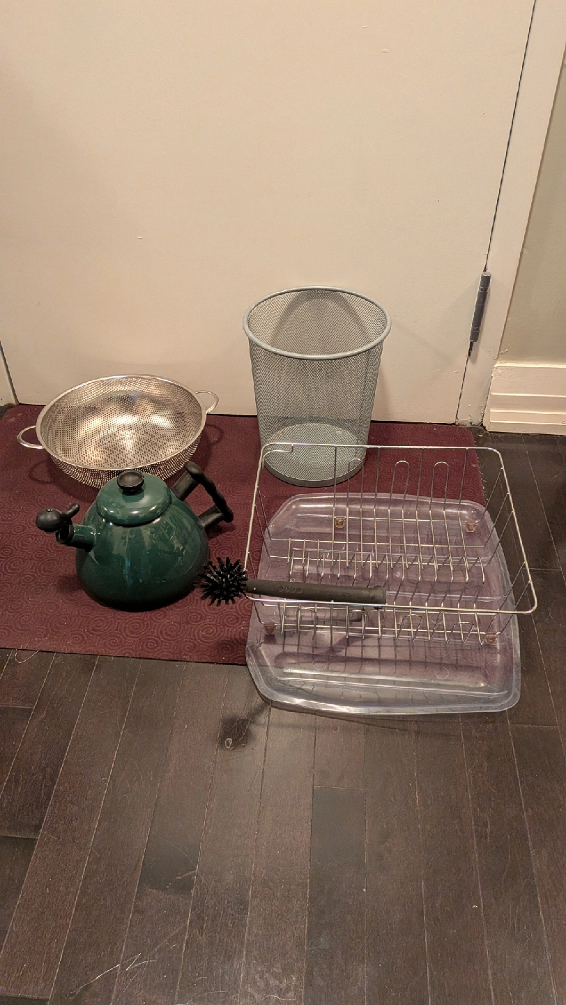 $5 each item or $30 for the lot! Selling a kitchenware bundle that includes strainer, baking items, dish rack, broom and other useful items for your kitchen. Well over $100 worth of goods. Great for someone setting up a new home or looking to expand their current collection! All items are in good condition and ready for a new home