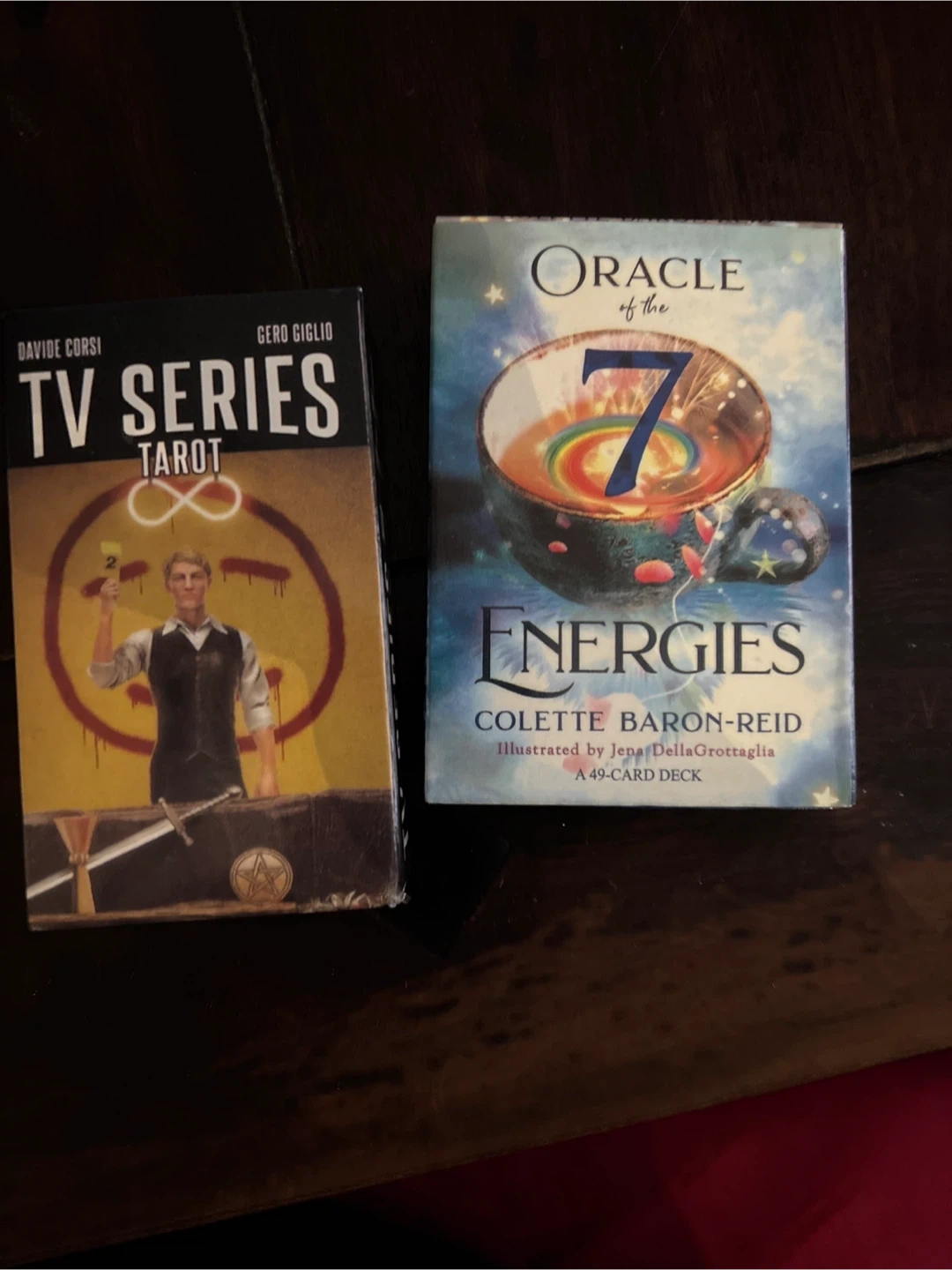 two decks of cards: - TV Series Tarot by Davide Corsi and Gero Giglio - Oracle of the 7 Energies by Colette Baron-Reid, a 49-card deck No guide books